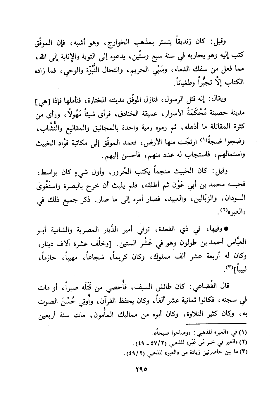 وقيل: كان زنديقا يتستر بمذهب الخوارج، وهو أشبه، فإن الموفّق كتب إليه وهو يحاربه في سنة سبع وستّين، يدعوه إلى التوبة والإنابة إلى الله، مما فعل من سفك الدماء، وسبي الحريم، وانتحال النّبوّة والوحي، فما زاده الكتاب إلّا تجبّرا وطغيانا.
