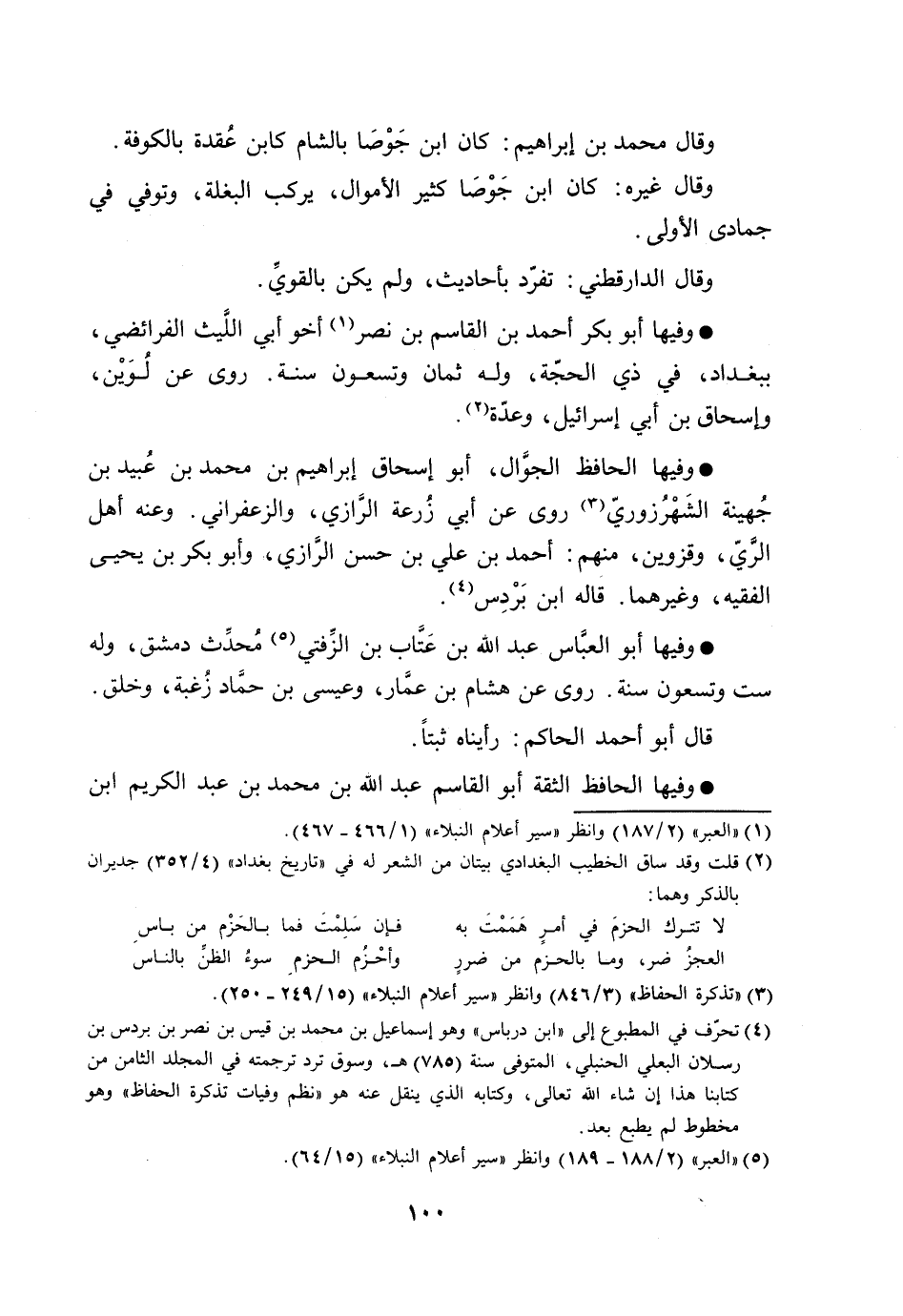 [4] تحرّف في المطبوع إلى «ابن درباس» وهو إسماعيل بن محمد بن قيس بن نصر بن بردس بن رسلان البعلي الحنبلي، المتوفى سنة (785) هـ، وسوق ترد ترجمته في المجلد الثامن من كتابنا هذا إن شاء الله تعالى، وكتابه الذي ينقل عنه هو «نظم وفيات تذكرة الحفاظ» وهو مخطوط لم يطبع بعد.
