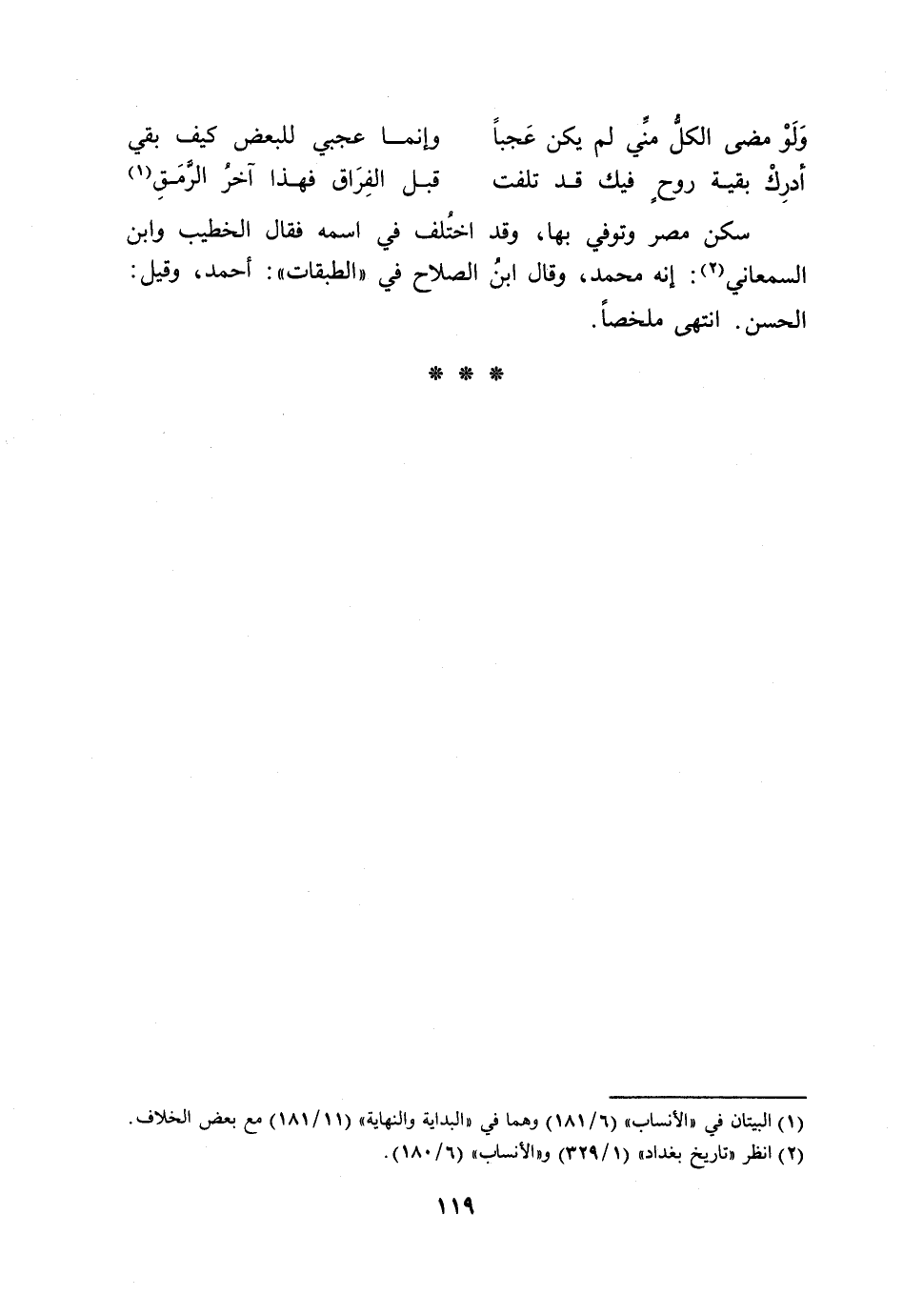 [1] سكن مصر وتوفي بها، وقد اختلف في اسمه فقال الخطيب وابن السمعاني [2] : إنه محمد، وقال ابن الصلاح في «الطبقات» : أحمد، وقيل: