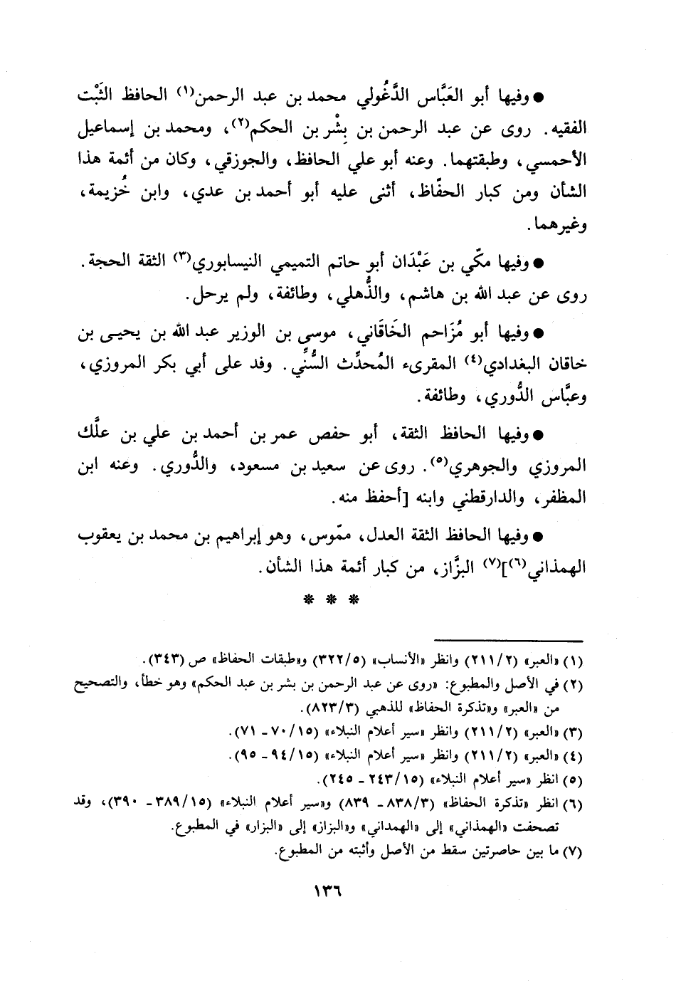 [6] انظر «تذكرة الحفاظ» (3/ 838- 839) و «سير أعلام النبلاء» (15/ 389- 390) ، وقد تصحفت «الهمذاني» إلى «الهمداني» و «البزاز» إلى «البزار» في المطبوع.