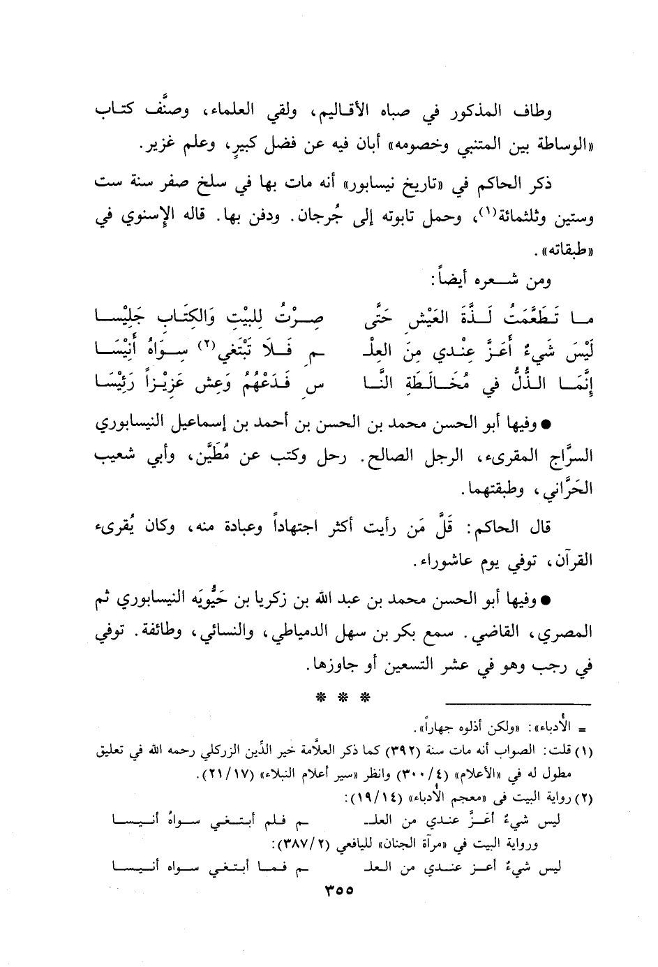 وفيها أبو الحسن محمد بن الحسن بن أحمد بن إسماعيل النيسابوري السرّاج المقرئ، الرجل الصالح. رحل وكتب عن مطيّن، وأبي شعيب الحرّاني، وطبقتهما.
