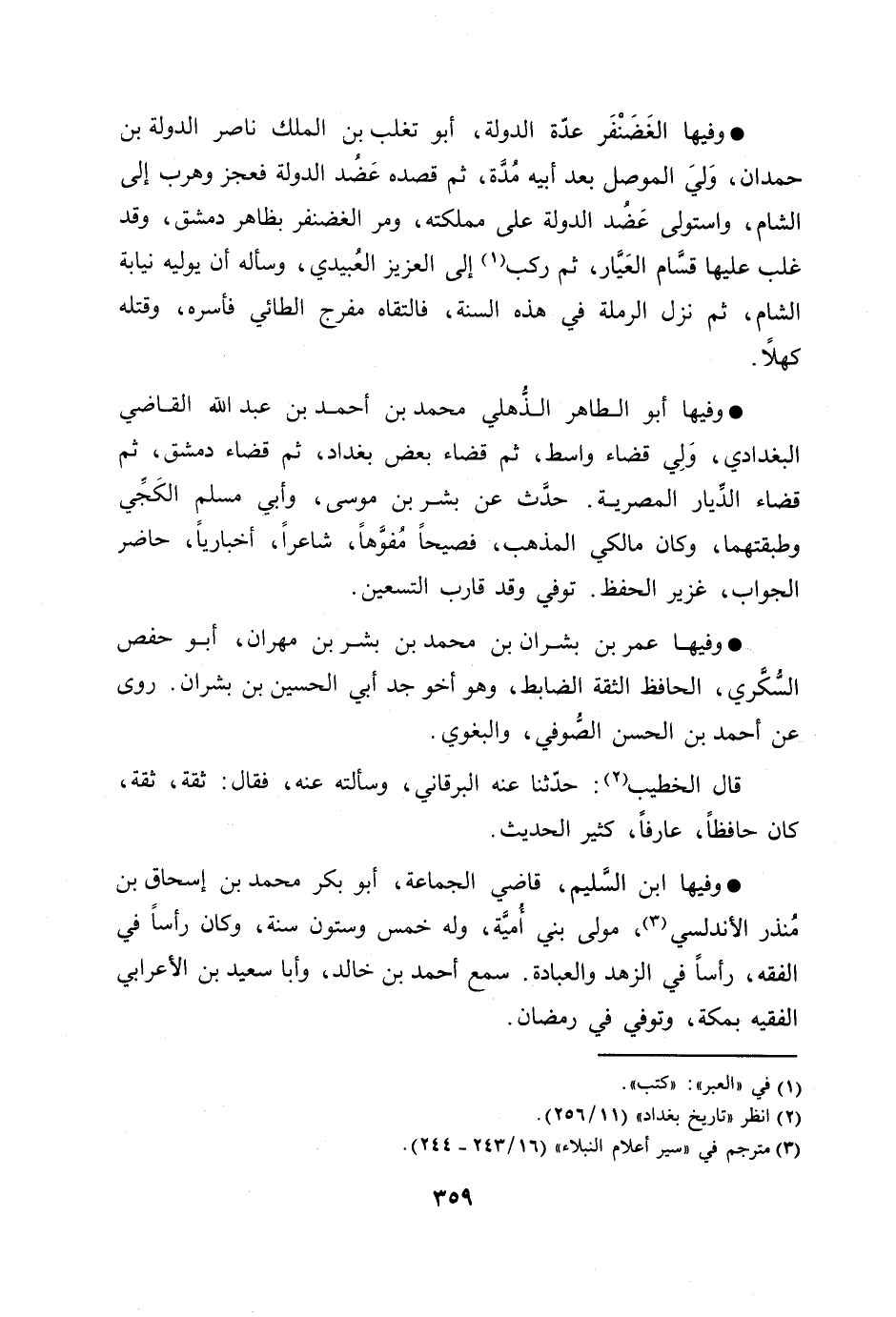 وفيها عمر بن بشران بن محمد بن بشر بن مهران، أبو حفص السّكّري، الحافظ الثقة الضابط، وهو أخو جد أبي الحسين بن بشران. روى عن أحمد بن الحسن الصّوفي، والبغوي.