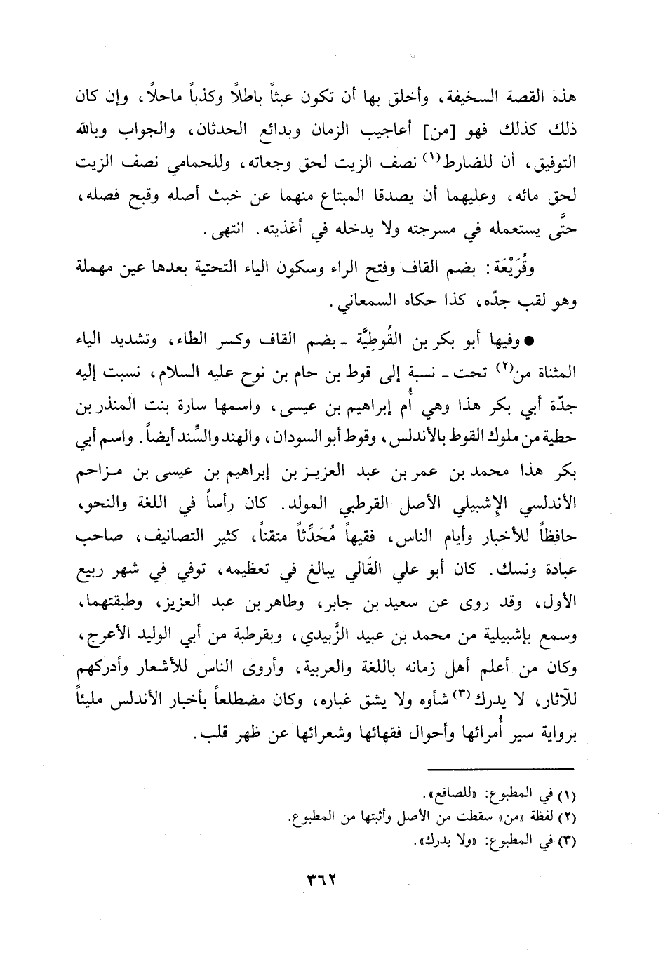 وفيها أبو بكر بن القوطيّة- بضم القاف وكسر الطاء، وتشديد الياء المثناة من [2] تحت- نسبة إلى قوط بن حام بن نوح عليه السلام، نسبت إليه جدّة أبي بكر هذا وهي أم إبراهيم بن عيسى، واسمها سارة بنت المنذر بن حطية من ملوك القوط بالأندلس، وقوط أبو السودان، والهند والسّند أيضا. واسم أبي بكر هذا محمد بن عمر بن عبد العزيز بن إبراهيم بن عيسى بن مزاحم الأندلسي الإشبيلي الأصل القرطبي المولد. كان رأسا في اللغة والنحو، حافظا للأخبار وأيام الناس، فقيها محدّثا متقنا، كثير التصانيف، صاحب عبادة ونسك. كان أبو علي القالي يبالغ في تعظيمه، توفي في شهر ربيع الأول، وقد روى عن سعيد بن جابر، وطاهر بن عبد العزيز، وطبقتهما، وسمع بإشبيلية من محمد بن عبيد الزّبيدي، وبقرطبة من أبي الوليد الأعرج، وكان من أعلم أهل زمانه باللغة والعربية، وأروى الناس للأشعار وأدركهم للآثار، لا يدرك [3] شأوه ولا يشق غباره، وكان مضطلعا بأخبار الأندلس مليئا برواية سير أمرائها وأحوال فقهائها وشعرائها عن ظهر قلب.