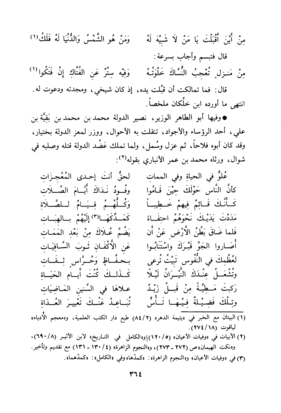 [1] البيتان مع الخبر في «يتيمة الدهر» (2/ 84) طبع دار الكتب العلمية، و «معجم الأدباء» لياقوت (18/ 274) .