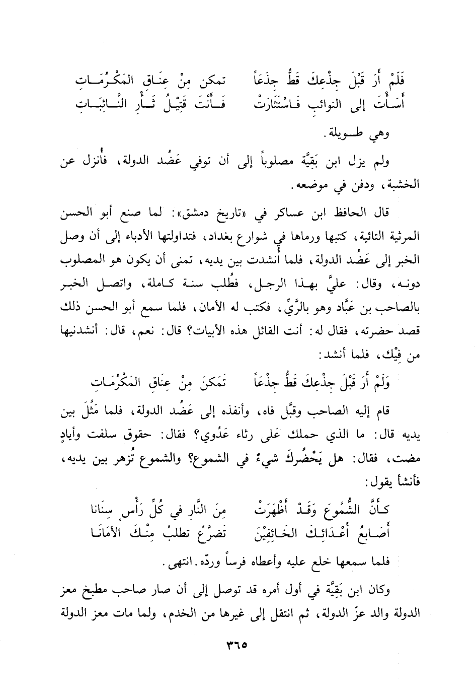 ولم يزل ابن بقيّة مصلوبا إلى أن توفي عضد الدولة، فأنزل عن الخشبة، ودفن في موضعه.