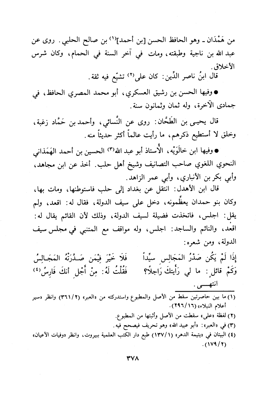 من همدان- وهو الحافظ الحسن [بن أحمد] [1] بن صالح الحلبي. روى عن عبد الله بن ناجية وطبقته، ومات في آخر السنة في الحمام، وكان شرس الأخلاق.