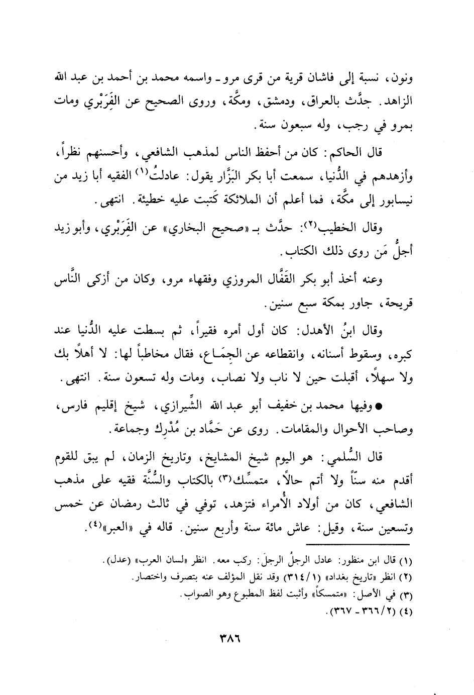 وفيها محمد بن خفيف أبو عبد الله الشّيرازي، شيخ إقليم فارس، وصاحب الأحوال والمقامات. روى عن حمّاد بن مدرك وجماعة.