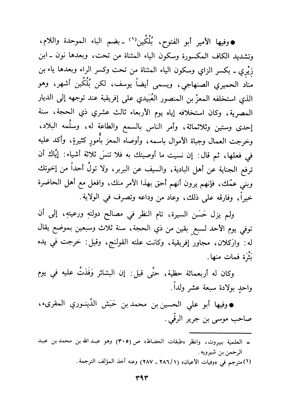 وفيها الأمير أبو الفتوح، بلكّين [1]- بضم الباء الموحدة واللام، وتشديد الكاف المكسورة وسكون الياء المثناة من تحت، وبعدها نون- ابن زيري- بكسر الزاي وسكون الياء المثناة من تحت وكسر الراء وبعدها ياء بن مناد الحميري الصنهاجي، ويسمى أيضا يوسف، لكن بلكّين أشهر، وهو الذي استخلفه المعزّ بن المنصور العبيدي على إفريقية عند توجهه إلى الديار المصرية، وكان استخلافه إياه يوم الأربعاء ثالث عشري ذي الحجة، سنة إحدى وستين وثلاثمائة، وأمر الناس بالسمع والطاعة له، وسلّمه البلاد، وخرجت العمال وجباة الأموال باسمه، وأوصاه المعز بأمور كثيرة، وأكد عليه في فعلها، ثم قال: إن نسيت ما أوصيتك به فلا تنس ثلاثة أشياء: إيّاك أن ترفع الجناية عن أهل البادية، والسيف عن البربر، ولا تولّ أحدا من إخوتك وبني عمّك، فإنهم يرون أنهم أحق بهذا الأمر منك، وافعل مع أهل الحاضرة خيرا، وفارقه على ذلك، وعاد من وداعه وتصرف في الولاية.