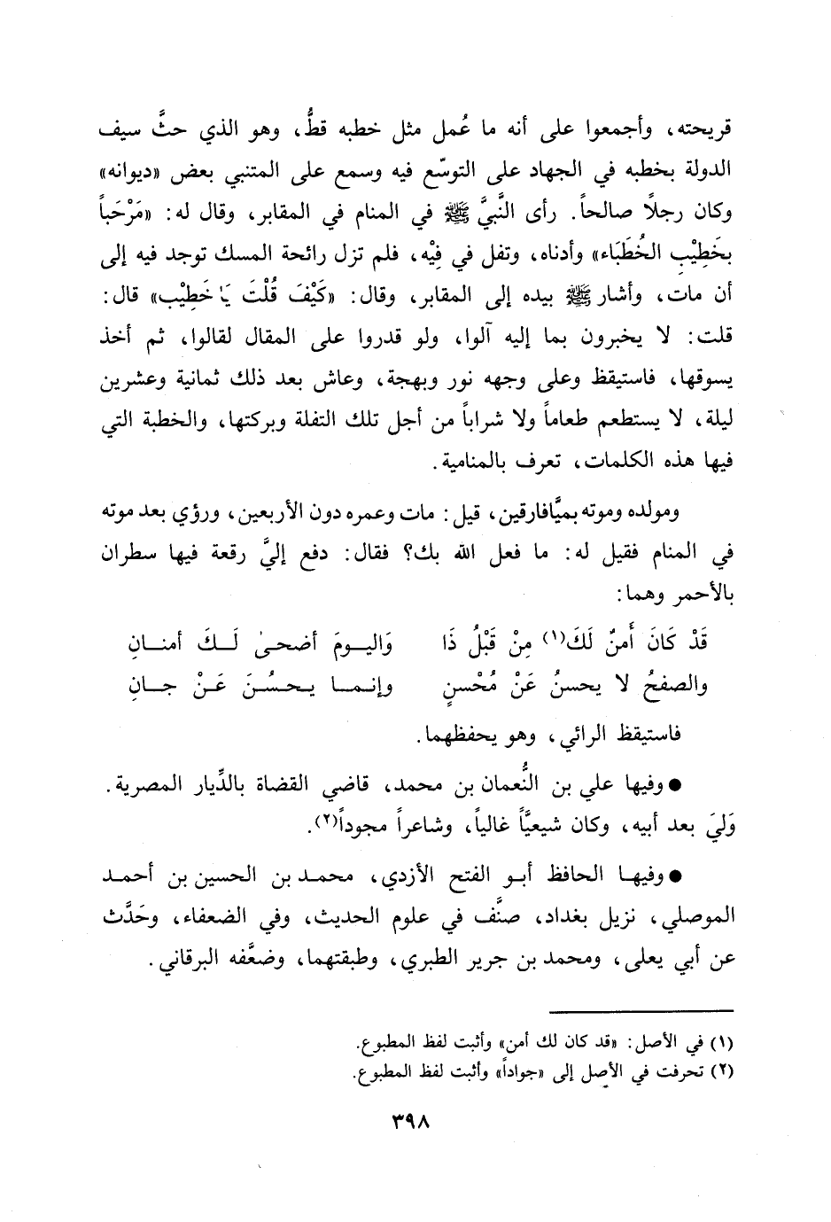 قريحته، وأجمعوا على أنه ما عمل مثل خطبه قطّ، وهو الذي حثّ سيف الدولة بخطبه في الجهاد على التوسّع فيه وسمع على المتنبي بعض «ديوانه» وكان رجلا صالحا. رأى النّبيّ صلى الله عليه وسلم في المنام في المقابر، وقال له: «مرحبا بخطيب الخطباء» وأدناه، وتفل في فيه، فلم تزل رائحة المسك توجد فيه إلى أن مات، وأشار صلى الله عليه وسلم بيده إلى المقابر، وقال: «كيف قلت يا خطيب» قال: