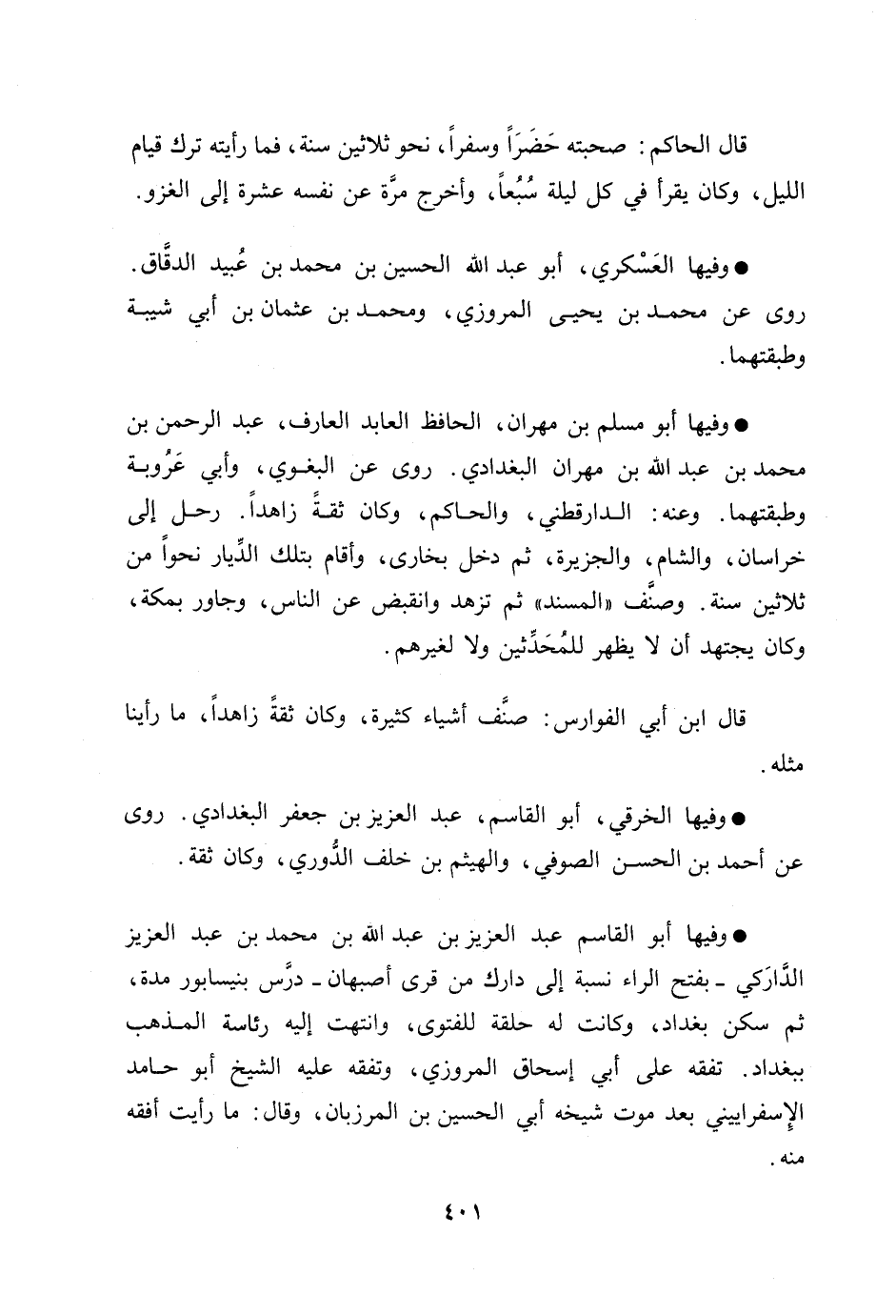 وفيها الخرقي، أبو القاسم، عبد العزيز بن جعفر البغدادي. روى عن أحمد بن الحسن الصوفي، والهيثم بن خلف الدّوري، وكان ثقة.