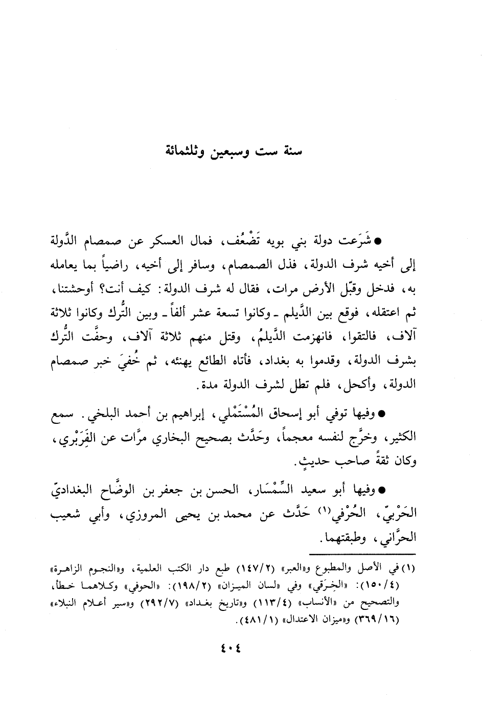 [1] في الأصل والمطبوع و «العبر» (2/ 147) طبع دار الكتب العلمية، و «النجوم الزاهرة» (4/ 150) : «الخرقي» وفي «لسان الميزان» (2/ 198) : «الحوفي» وكلاهما خطأ، والتصحيح من «الأنساب» (4/ 113) و «تاريخ بغداد» (7/ 292) و «سير أعلام النبلاء» (16/ 369) و «ميزان الاعتدال» (1/ 481) .