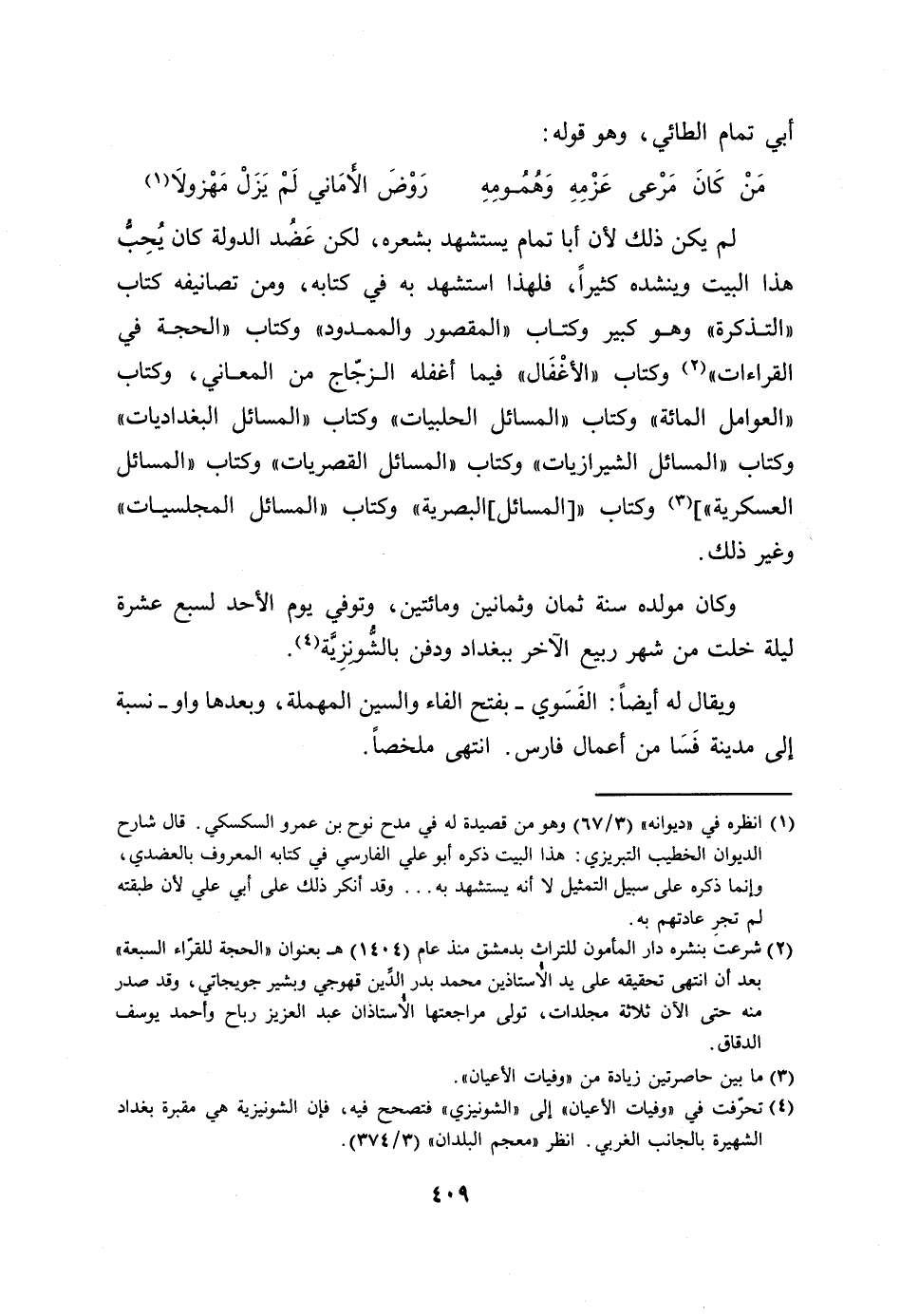 لم يكن ذلك لأن أبا تمام يستشهد بشعره، لكن عضد الدولة كان يحبّ هذا البيت وينشده كثيرا، فلهذا استشهد به في كتابه، ومن تصانيفه كتاب «التذكرة» وهو كبير وكتاب «المقصور والممدود» وكتاب «الحجة في القراءات» [2] وكتاب «الأغفال» فيما أغفله الزجّاج من المعاني، وكتاب «العوامل المائة» وكتاب «المسائل الحلبيات» وكتاب «المسائل البغداديات» وكتاب «المسائل الشيرازيات» وكتاب «المسائل القصريات» وكتاب «المسائل العسكرية» ] [3] وكتاب « [المسائل] البصرية» وكتاب «المسائل المجلسيات» وغير ذلك.