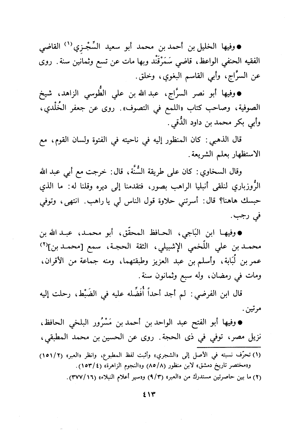 وفيها أبو نصر السرّاج، عبد الله بن علي الطّوسي الزاهد، شيخ الصوفية، وصاحب كتاب «اللمع في التصوف» . روى عن جعفر الخلدي، وأبي بكر محمد بن داود الدّقي.