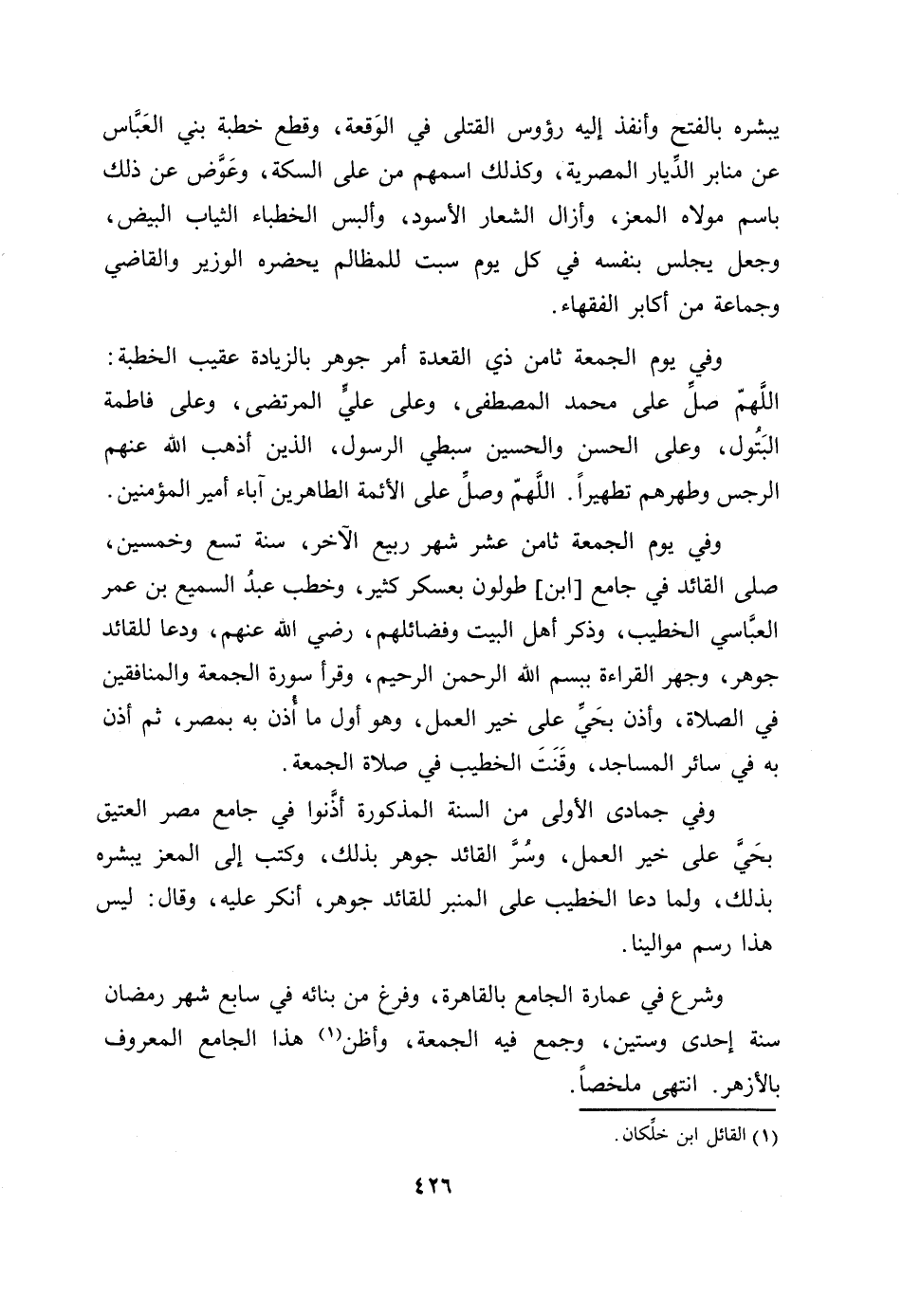 وشرع في عمارة الجامع بالقاهرة، وفرغ من بنائه في سابع شهر رمضان سنة إحدى وستين، وجمع فيه الجمعة، وأظن [1] هذا الجامع المعروف بالأزهر. انتهى ملخصا.