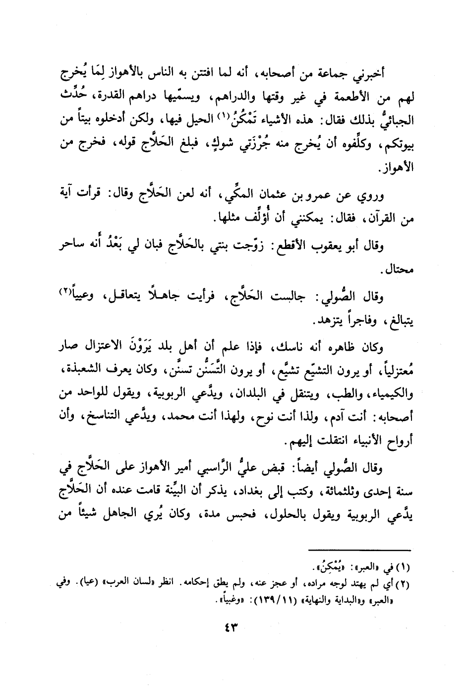 أخبرني جماعة من أصحابه، أنه لما افتتن به الناس بالأهواز لما يخرج لهم من الأطعمة في غير وقتها والدراهم، ويسمّيها دراهم القدرة، حدّث الجبائيّ بذلك فقال: هذه الأشياء تمكن [1] الحيل فيها، ولكن أدخلوه بيتا من بيوتكم، وكلّفوه أن يخرج منه جرزتي شوك، فبلغ الحلّاج قوله، فخرج من الأهواز.