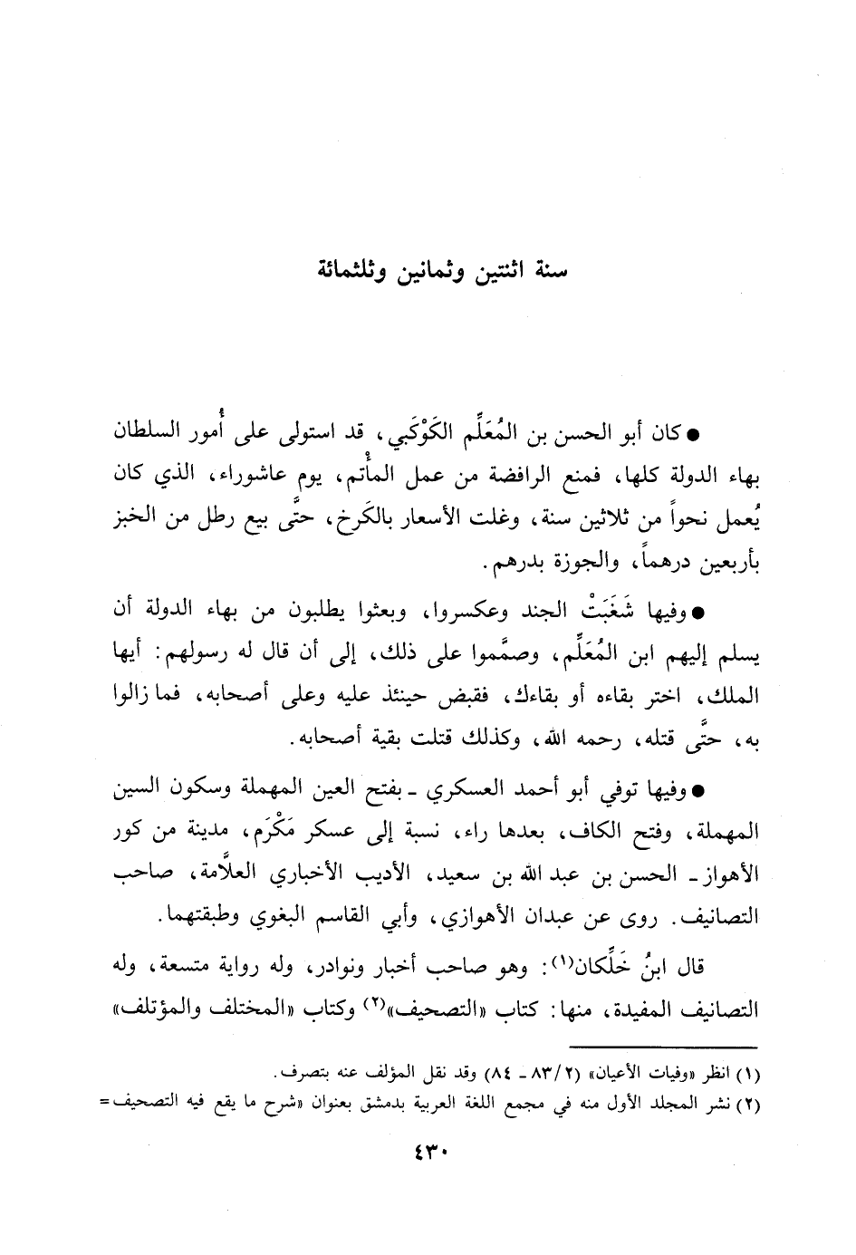 وفيها شغبت الجند وعسكروا، وبعثوا يطلبون من بهاء الدولة أن يسلم إليهم ابن المعلّم، وصمّموا على ذلك، إلى أن قال له رسولهم: أيها الملك، اختر بقاءه أو بقاءك، فقبض حينئذ عليه وعلى أصحابه، فما زالوا به، حتّى قتله، رحمه الله، وكذلك قتلت بقية أصحابه.