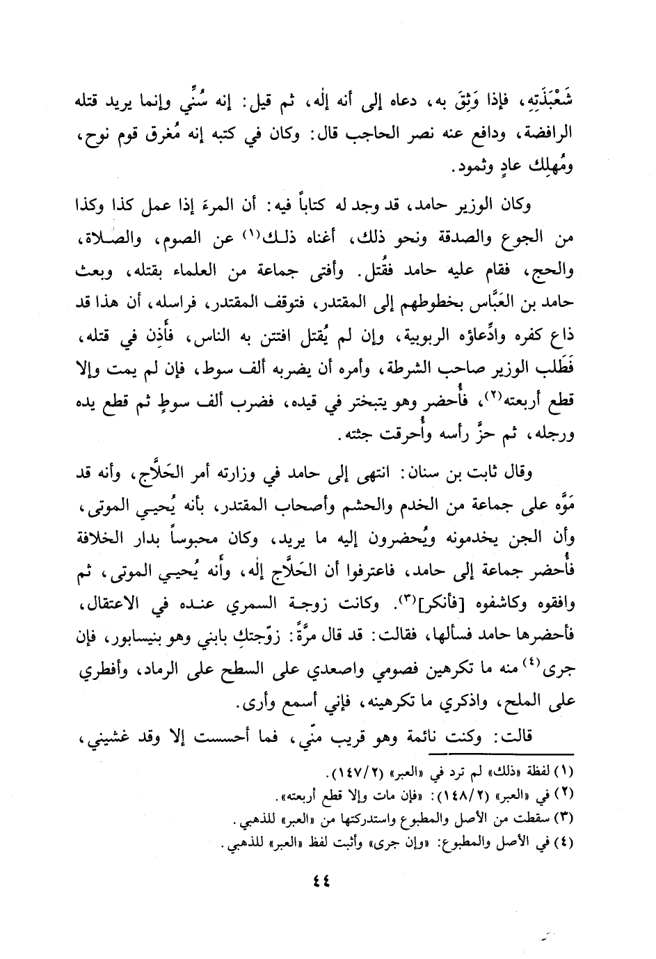 وكان الوزير حامد، قد وجد له كتابا فيه: أن المرء إذا عمل كذا وكذا من الجوع والصدقة ونحو ذلك، أغناه ذلك [1] عن الصوم، والصلاة، والحج، فقام عليه حامد فقتل. وأفتى جماعة من العلماء بقتله، وبعث حامد بن العبّاس بخطوطهم إلى المقتدر، فتوقف المقتدر، فراسله، أن هذا قد ذاع كفره وادّعاؤه الربوبية، وإن لم يقتل افتتن به الناس، فأذن في قتله، فطلب الوزير صاحب الشرطة، وأمره أن يضربه ألف سوط، فإن لم يمت وإلا قطع أربعته [2] ، فأحضر وهو يتبختر في قيده، فضرب ألف سوط ثم قطع يده ورجله، ثم حزّ رأسه وأحرقت جثته.