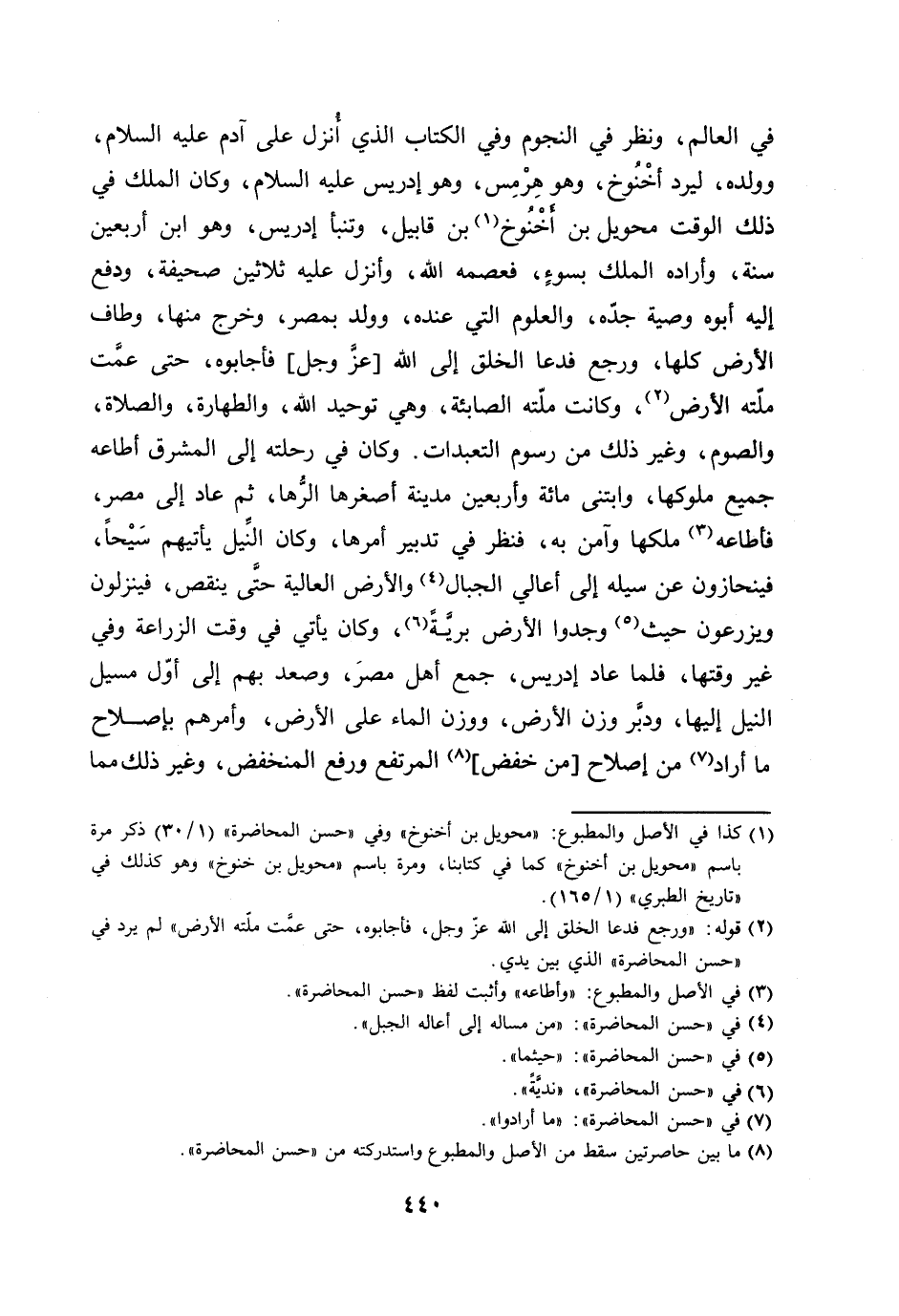 في العالم، ونظر في النجوم وفي الكتاب الذي أنزل على آدم عليه السلام، وولده، ليرد أخنوخ، وهو هرمس، وهو إدريس عليه السلام، وكان الملك في ذلك الوقت محويل بن أخنوخ [1] بن قابيل، وتنبأ إدريس، وهو ابن أربعين سنة، وأراده الملك بسوء، فعصمه الله، وأنزل عليه ثلاثين صحيفة، ودفع إليه أبوه وصية جدّه، والعلوم التي عنده، وولد بمصر، وخرج منها، وطاف الأرض كلها، ورجع فدعا الخلق إلى الله [عزّ وجل] فأجابوه، حتى عمّت ملّته الأرض [2] ، وكانت ملّته الصابئة، وهي توحيد الله، والطهارة، والصلاة، والصوم، وغير ذلك من رسوم التعبدات. وكان في رحلته إلى المشرق أطاعه جميع ملوكها، وابتنى مائة وأربعين مدينة أصغرها الرّها، ثم عاد إلى مصر، فأطاعه [3] ملكها وآمن به، فنظر في تدبير أمرها، وكان النّيل يأتيهم سيحا، فينحازون عن سيله إلى أعالي الجبال [4] والأرض العالية حتّى ينقص، فينزلون ويزرعون حيث [5] وجدوا الأرض بريّة [6] ، وكان يأتي في وقت الزراعة وفي غير وقتها، فلما عاد إدريس، جمع أهل مصر، وصعد بهم إلى أوّل مسيل النيل إليها، ودبّر وزن الأرض، ووزن الماء على الأرض، وأمرهم بإصلاح ما أراد [7] من إصلاح [من خفض] [8] المرتفع ورفع المنخفض، وغير ذلك مما