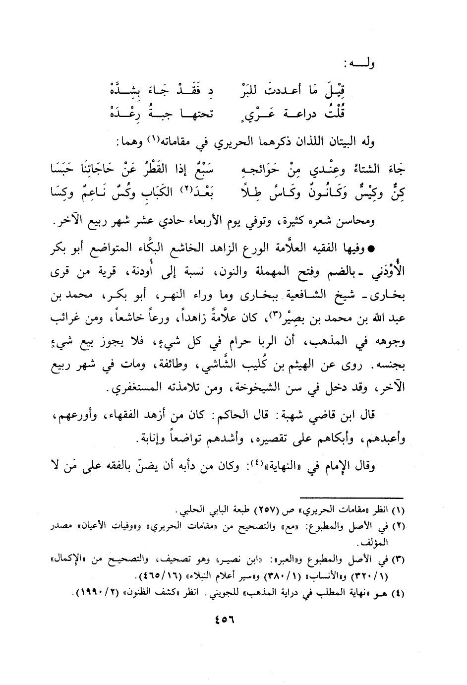 وفيها الفقيه العلّامة الورع الزاهد الخاشع البكّاء المتواضع أبو بكر الأودني- بالضم وفتح المهملة والنون، نسبة إلى أودنة، قرية من قرى بخارى- شيخ الشافعية ببخارى وما وراء النهر، أبو بكر، محمد بن عبد الله بن محمد بن بصير [3] ، كان علّامة زاهدا، ورعا خاشعا، ومن غرائب وجوهه في المذهب، أن الربا حرام في كل شيء، فلا يجوز بيع شيء بجنسه. روى عن الهيثم بن كليب الشّاشي، وطائفة، ومات في شهر ربيع الآخر، وقد دخل في سن الشيخوخة، ومن تلامذته المستغفري.