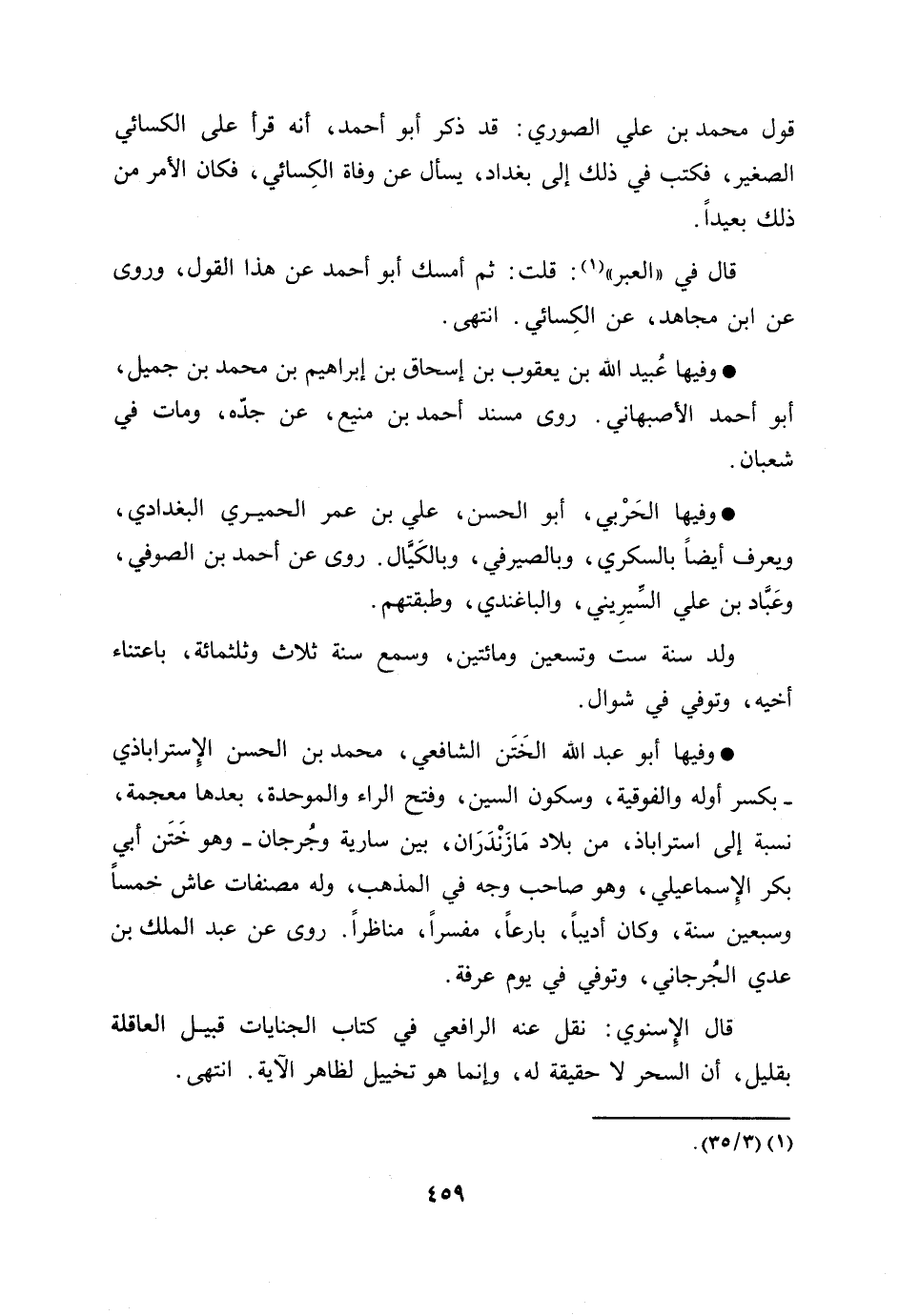 وفيها أبو عبد الله الختن الشافعي، محمد بن الحسن الإستراباذي- بكسر أوله والفوقية، وسكون السين، وفتح الراء والموحدة، بعدها معجمة، نسبة إلى استراباذ، من بلاد مازندران، بين سارية وجرجان- وهو ختن أبي بكر الإسماعيلي، وهو صاحب وجه في المذهب، وله مصنفات عاش خمسا وسبعين سنة، وكان أديبا، بارعا، مفسرا، مناظرا. روى عن عبد الملك بن عدي الجرجاني، وتوفي في يوم عرفة.