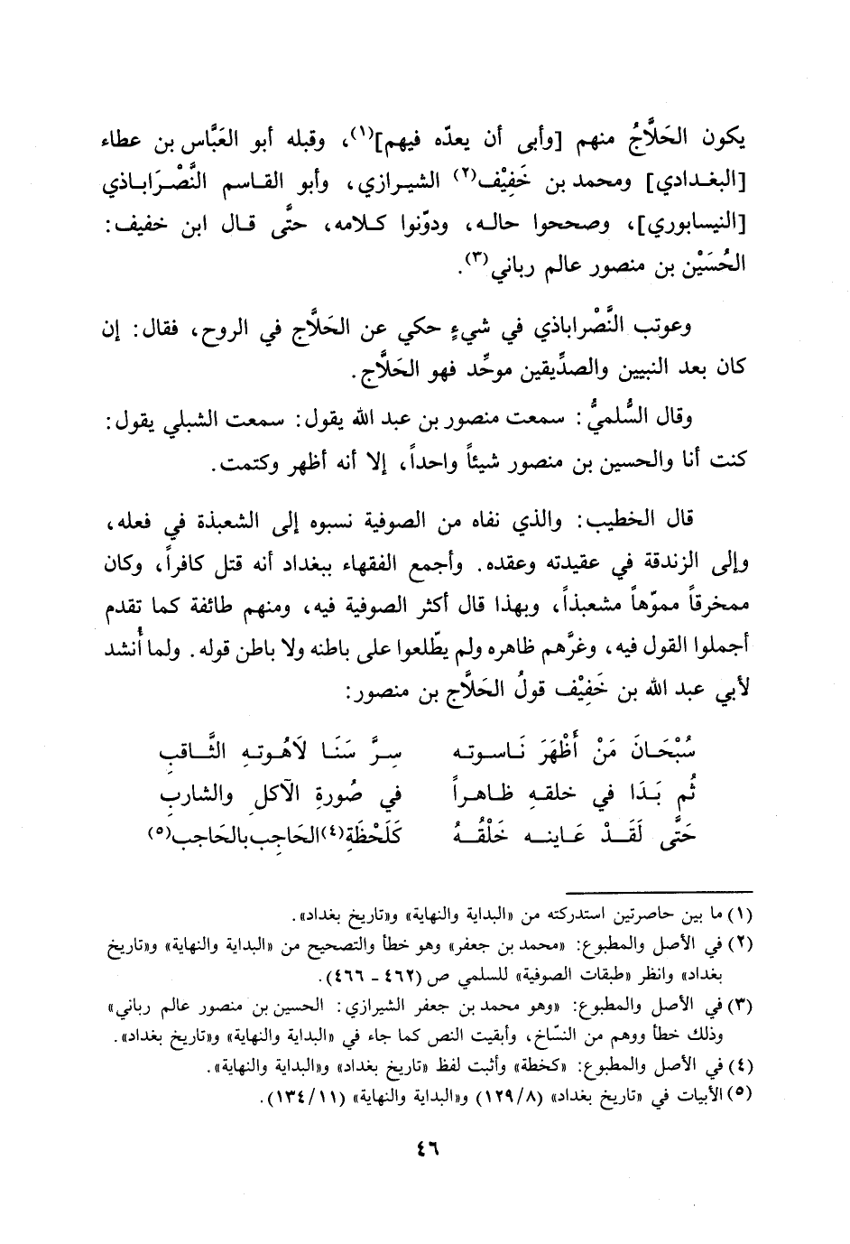 [3] في الأصل والمطبوع: «وهو محمد بن جعفر الشيرازي: الحسين بن منصور عالم رباني» وذلك خطأ ووهم من النسّاخ، وأبقيت النص كما جاء في «البداية والنهاية» و «تاريخ بغداد» .