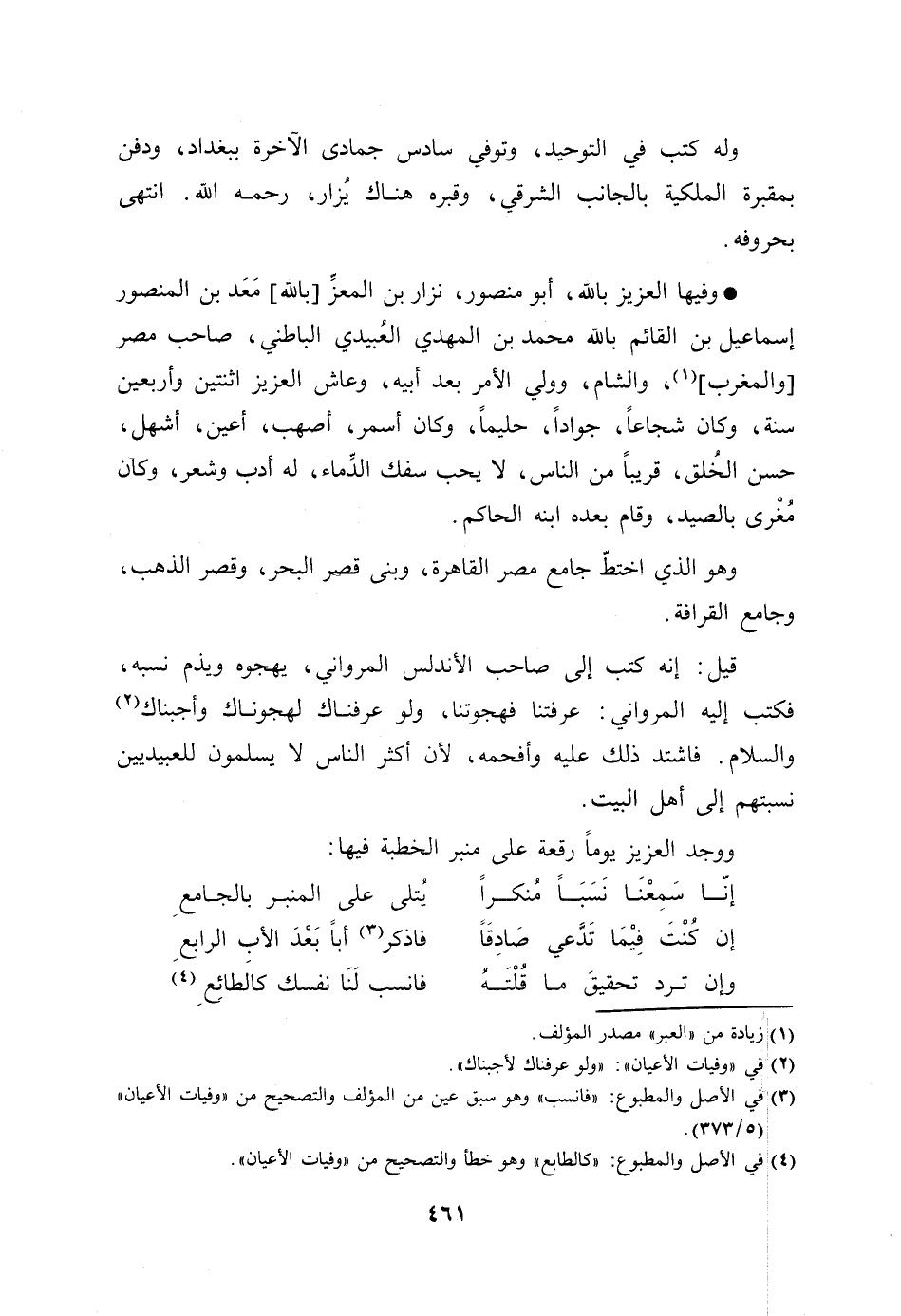 وفيها العزيز بالله، أبو منصور، نزار بن المعزّ [بالله] معد بن المنصور إسماعيل بن القائم بالله محمد بن المهدي العبيدي الباطني، صاحب مصر [والمغرب] [1] ، والشام، وولي الأمر بعد أبيه، وعاش العزيز اثنتين وأربعين سنة، وكان شجاعا، جوادا، حليما، وكان أسمر، أصهب، أعين، أشهل، حسن الخلق، قريبا من الناس، لا يحب سفك الدّماء، له أدب وشعر، وكان مغرى بالصيد، وقام بعده ابنه الحاكم.