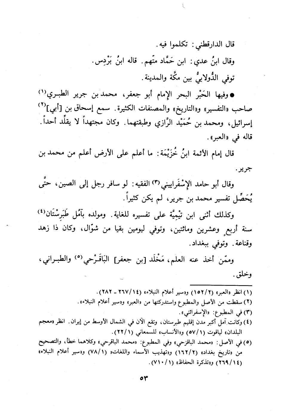 وفيها الحبر البحر الإمام أبو جعفر، محمد بن جرير الطبري [1] صاحب «التفسير» و «التاريخ» والمصنفات الكثيرة. سمع إسحاق بن [أبي] [2] إسرائيل، ومحمد بن حميد الرّازي وطبقتهما. وكان مجتهدا لا يقلّد أحدا.