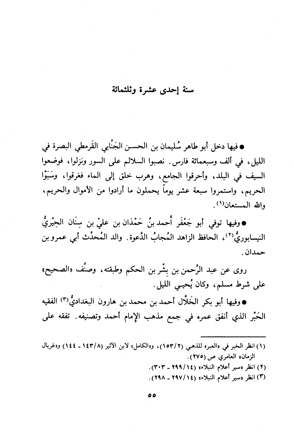وفيها أبو بكر الخلّال أحمد بن محمد بن هارون البغداديّ [3] الفقيه الحبر الذي أنفق عمره في جمع مذهب الإمام أحمد وتصنيفه. تفقه على