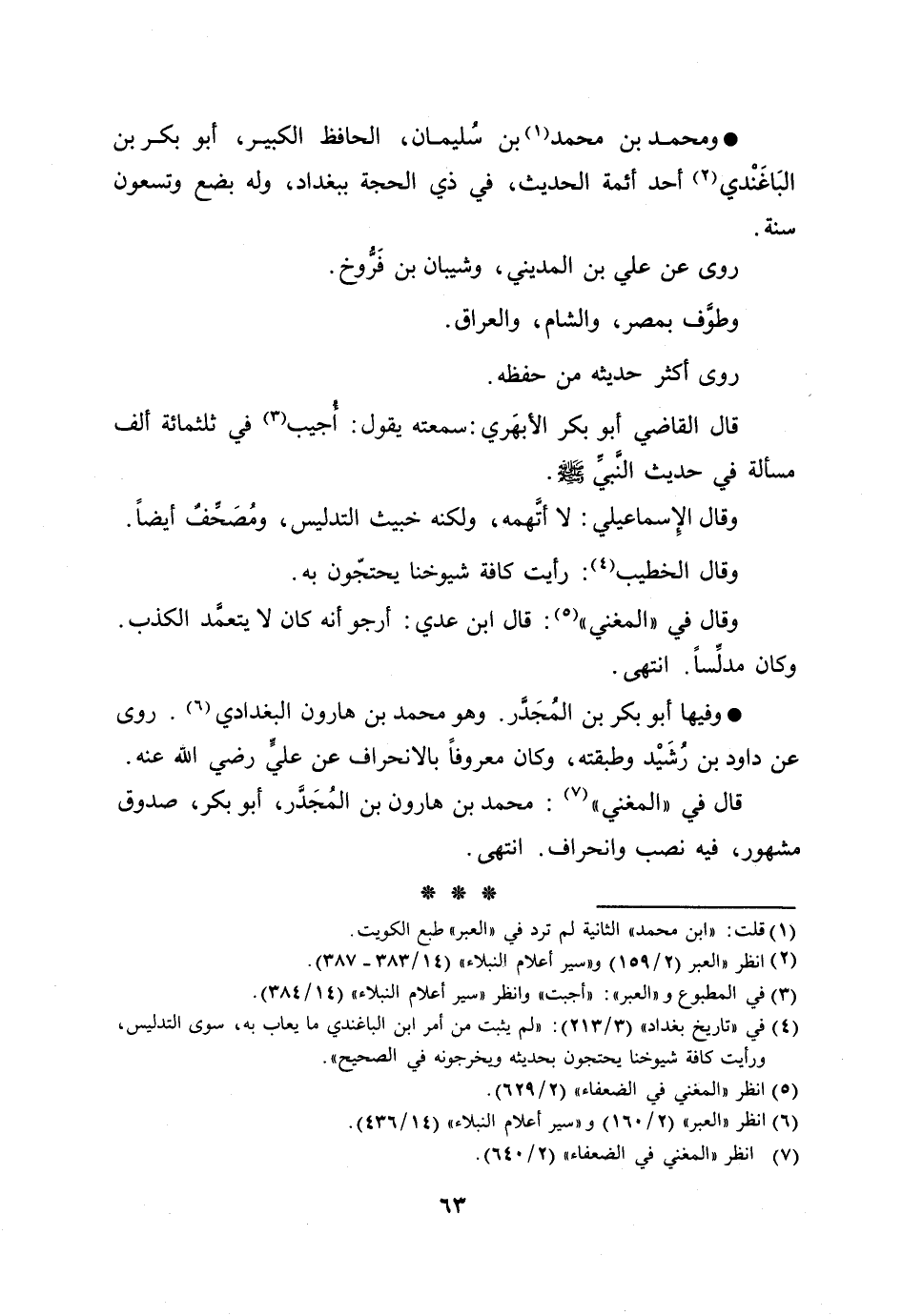 [4] في «تاريخ بغداد» (3/ 213) : «لم يثبت من أمر ابن الباغندي ما يعاب به، سوى التدليس، ورأيت كافة شيوخنا يحتجون بحديثه ويخرجونه في الصحيح» .