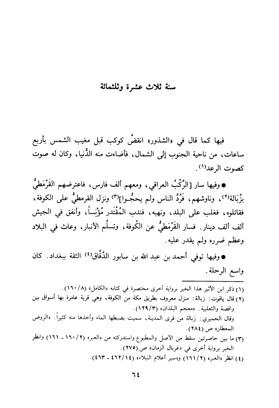 [3] ما بين حاصرتين سقط من الأصل والمطبوع واستدركته من «العبر» (2/ 160- 161) وانظر الخبر برواية أخرى في «غربال الزمان» ص (275) .