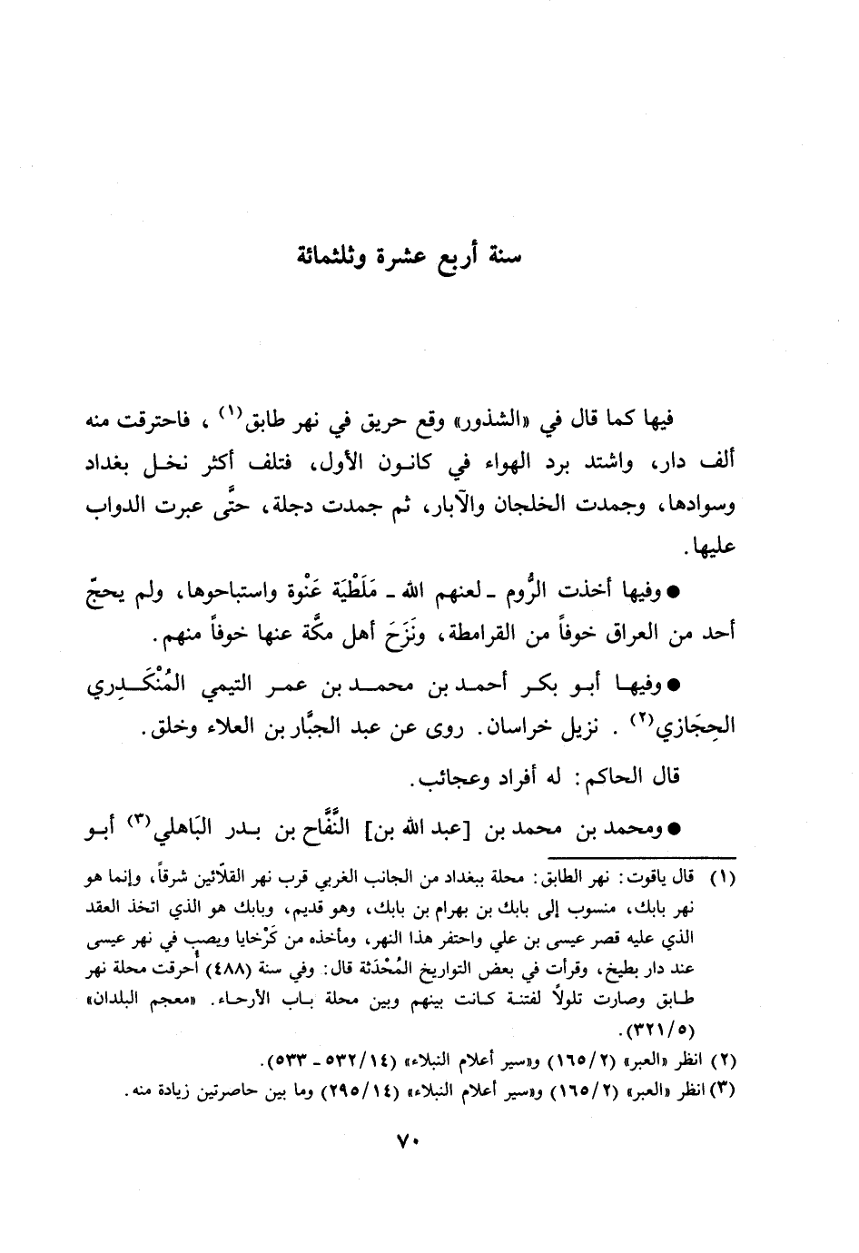 فيها كما قال في «الشذور» وقع حريق في نهر طابق [1] ، فاحترقت منه ألف دار، واشتد برد الهواء في كانون الأول، فتلف أكثر نخل بغداد وسوادها، وجمدت الخلجان والآبار، ثم جمدت دجلة، حتّى عبرت الدواب عليها.