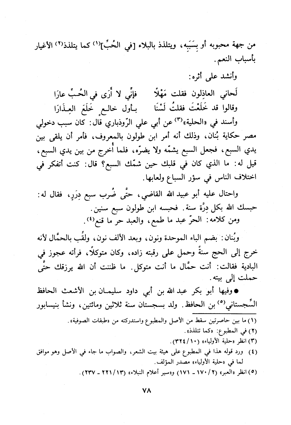 [4] ورد قوله هذا في المطبوع على هيئة بيت الشعر، والصواب ما جاء في الأصل وهو موافق لما في «حلية الأولياء» مصدر المؤلف.