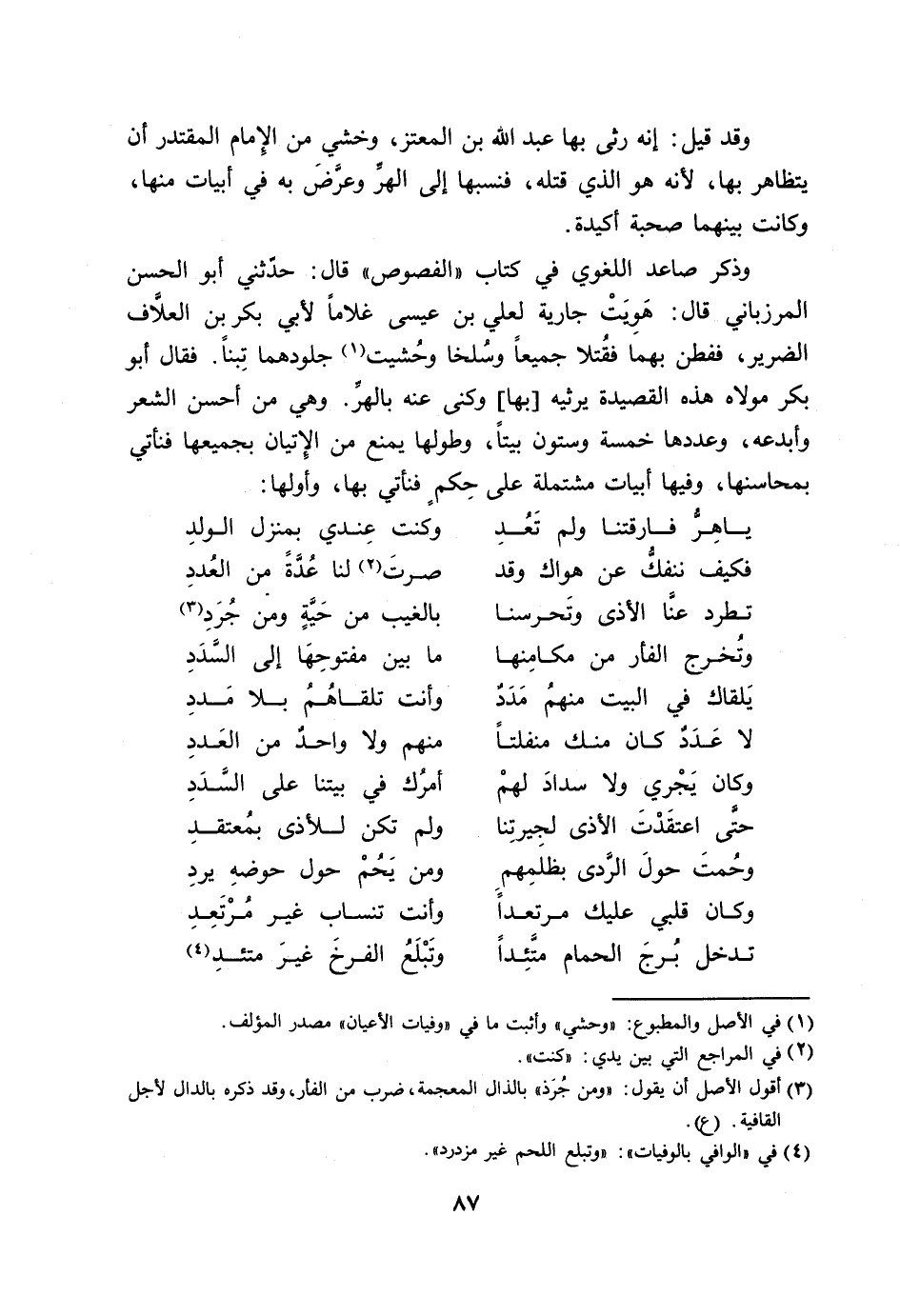 وذكر صاعد اللغوي في كتاب «الفصوص» قال: حدّثني أبو الحسن المرزباني قال: هويت جارية لعلي بن عيسى غلاما لأبي بكر بن العلّاف الضرير، ففطن بهما فقتلا جميعا وسلخا وحشيت [1] جلودهما تبنا. فقال أبو بكر مولاه هذه القصيدة يرثيه [بها] وكنى عنه بالهرّ. وهي من أحسن الشعر وأبدعه، وعددها خمسة وستون بيتا، وطولها يمنع من الإتيان بجميعها فنأتي بمحاسنها، وفيها أبيات مشتملة على حكم فنأتي بها، وأولها: