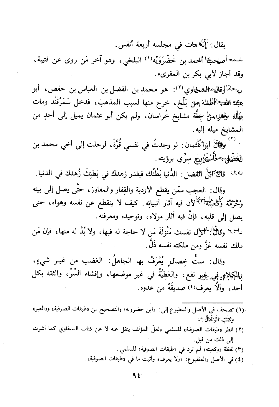 [2] انظر «طبقات الصوفية» للسلمي ولعلّ المؤلف ينقل عنه لا عن كتاب السخاوي كما أشرت إلى ذلك من قبل.