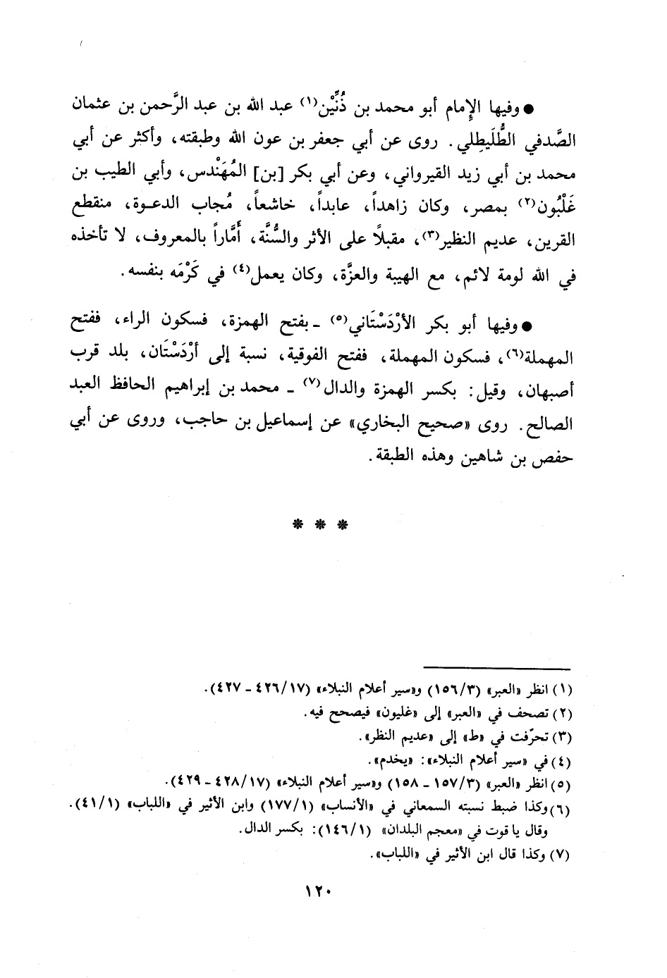 وفيها أبو بكر الأردستاني [5]- بفتح الهمزة، فسكون الراء، ففتح المهملة [6] ، فسكون المهملة، ففتح الفوقية، نسبة إلى أردستان، بلد قرب أصبهان، وقيل: بكسر الهمزة والدال [7]- محمد بن إبراهيم الحافظ العبد الصالح. روى «صحيح البخاري» عن إسماعيل بن حاجب، وروى عن أبي حفص بن شاهين وهذه الطبقة.