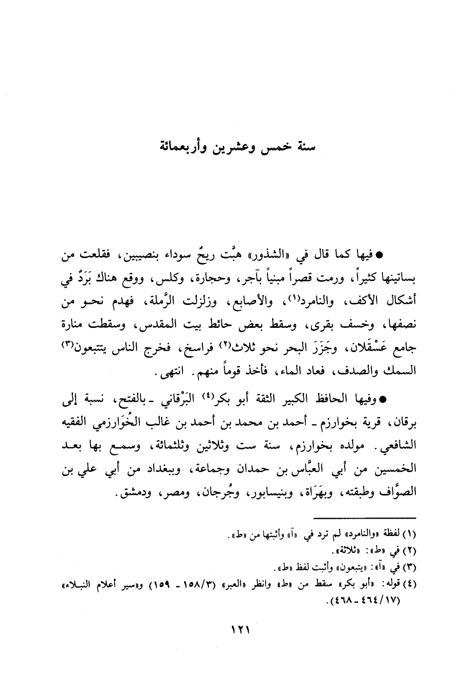 فيها كما قال في «الشذور» هبّت ريح سوداء بنصيبين، فقلعت من بساتينها كثيرا، ورمت قصرا مبنيا بآجر، وحجارة، وكلس، ووقع هناك برد في أشكال الأكف، والنامرد [1] ، والأصابع، وزلزلت الرّملة، فهدم نحو من نصفها، وخسف بقرى، وسقط بعض حائط بيت المقدس، وسقطت منارة جامع عسقلان، وجزر البحر نحو ثلاث [2] فراسخ، فخرج الناس يتتبعون [3] السمك والصدف، فعاد الماء، فأخذ قوما منهم. انتهى.