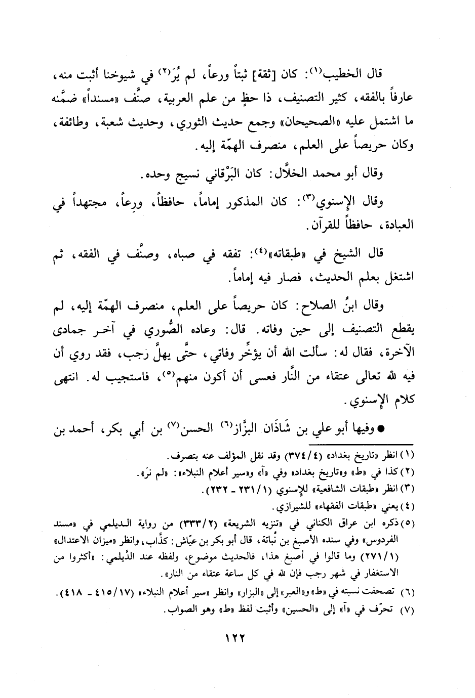 [6] تصحفت نسبته في «ط» و «العبر» إلى «البزار» وانظر «سير أعلام النبلاء» (17/ 415- 418) .