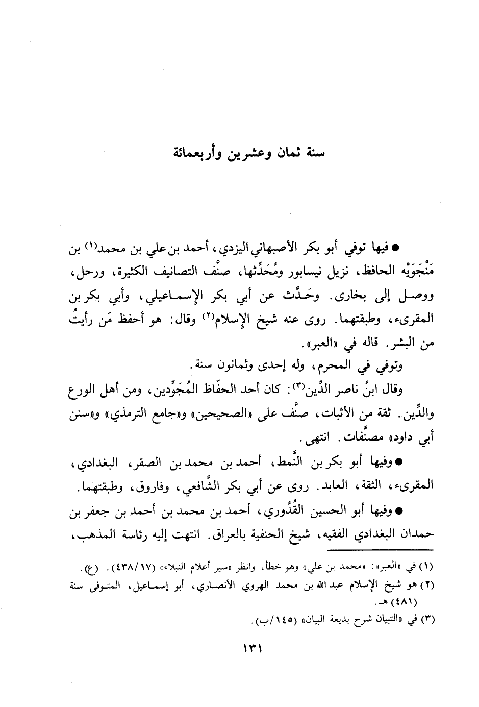 وفيها أبو بكر بن النّمط، أحمد بن محمد بن الصقر، البغدادي، المقرئ، الثقة، العابد. روى عن أبي بكر الشّافعي، وفاروق، وطبقتهما.