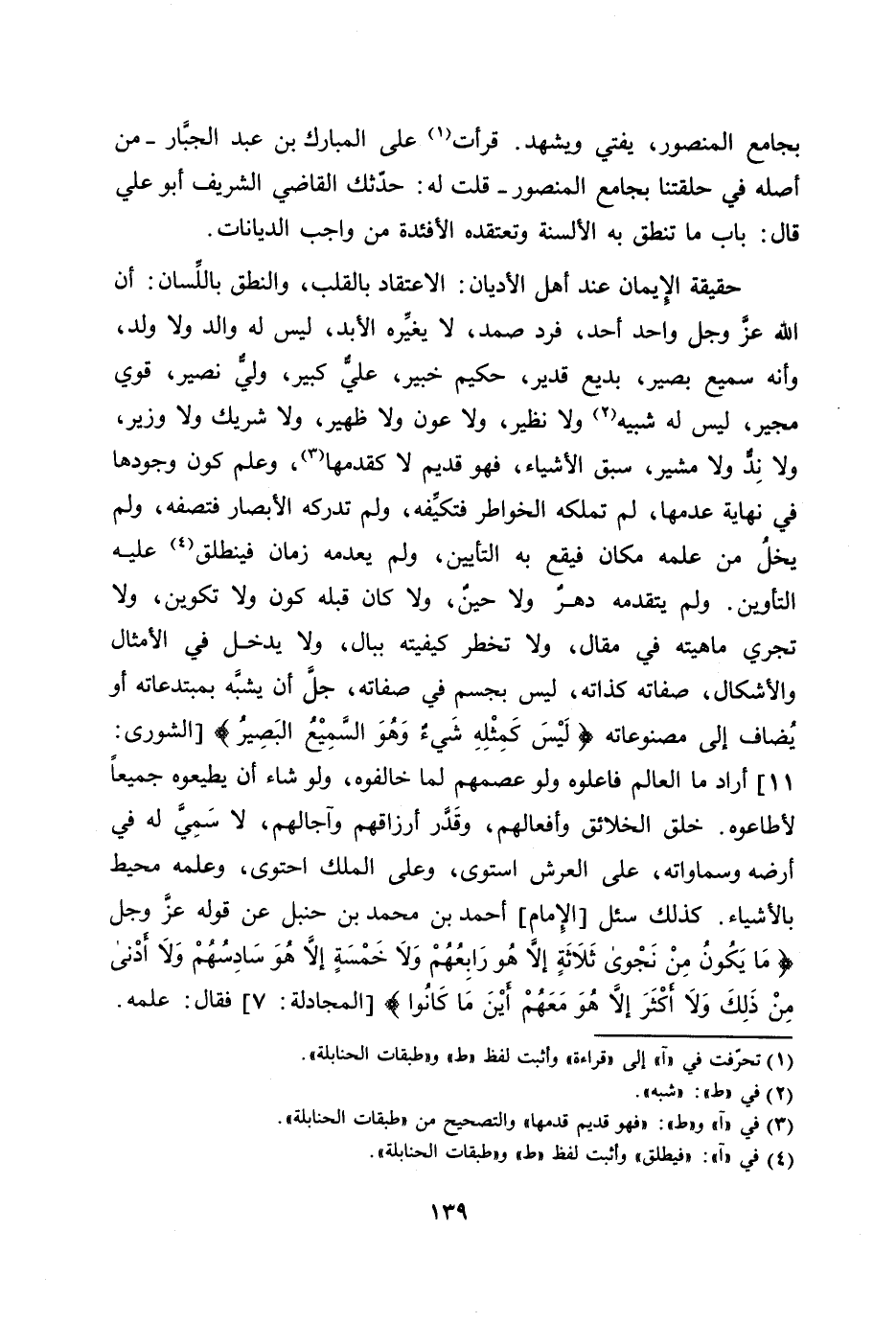 حقيقة الإيمان عند أهل الأديان: الاعتقاد بالقلب، والنطق باللّسان: أن الله عزّ وجل واحد أحد، فرد صمد، لا يغيّره الأبد، ليس له والد ولا ولد، وأنه سميع بصير، بديع قدير، حكيم خبير، عليّ كبير، وليّ نصير، قوي مجير، ليس له شبيه [2] ولا نظير، ولا عون ولا ظهير، ولا شريك ولا وزير، ولا ندّ ولا مشير، سبق الأشياء، فهو قديم لا كقدمها [3] ، وعلم كون وجودها في نهاية عدمها، لم تملكه الخواطر فتكيّفه، ولم تدركه الأبصار فتصفه، ولم يخل من علمه مكان فيقع به التأيين، ولم يعدمه زمان فينطلق [4] عليه التأوين. ولم يتقدمه دهر ولا حين، ولا كان قبله كون ولا تكوين، ولا تجري ماهيته في مقال، ولا تخطر كيفيته ببال، ولا يدخل في الأمثال والأشكال، صفاته كذاته، ليس بجسم في صفاته، جلّ أن يشبّه بمبتدعاته أو يضاف إلى مصنوعاته لَيْسَ كَمِثْلِهِ شَيْءٌ وَهُوَ السَّمِيعُ الْبَصِيرُ 42: 11 [الشورى: