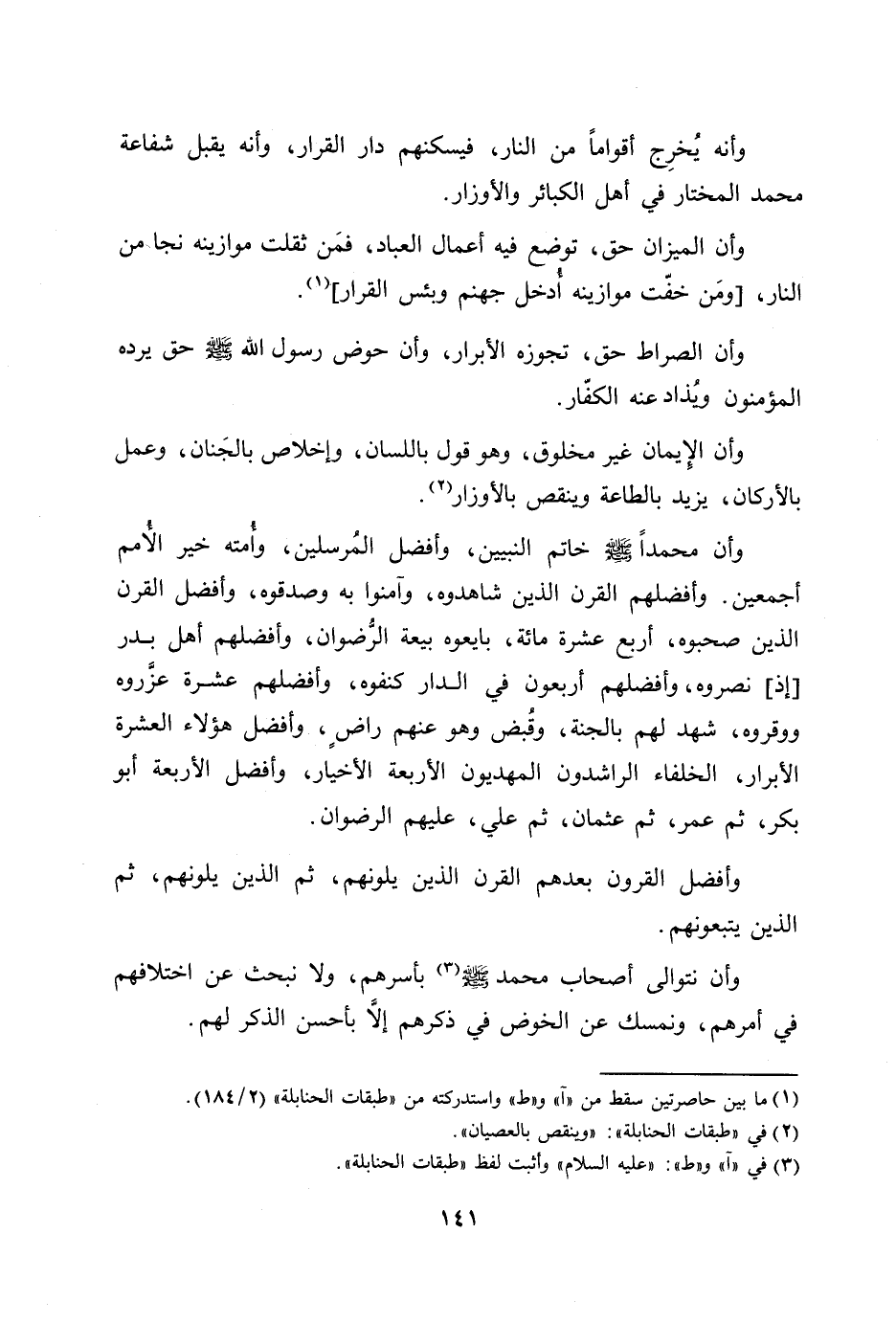 وأن محمدا صلّى الله عليه وسلّم خاتم النبيين، وأفضل المرسلين، وأمته خير الأمم أجمعين. وأفضلهم القرن الذين شاهدوه، وآمنوا به وصدقوه، وأفضل القرن الذين صحبوه، وأربع عشرة مائة، بايعوه بيعة الرّضوان، وأفضلهم أهل بدر [إذ] نصروه، وأفضلهم أربعون في الدار كنفوه، وأفضلهم عشرة عزّروه ووقروه، شهد لهم بالجنة، وقبض وهو عنهم راض، وأفضل هؤلاء العشرة الأبرار، والخلفاء الراشدون المهديون الأربعة الأخيار، وأفضل الأربعة أبو بكر، ثم عمر، ثم عثمان، ثم علي، عليهم الرضوان.