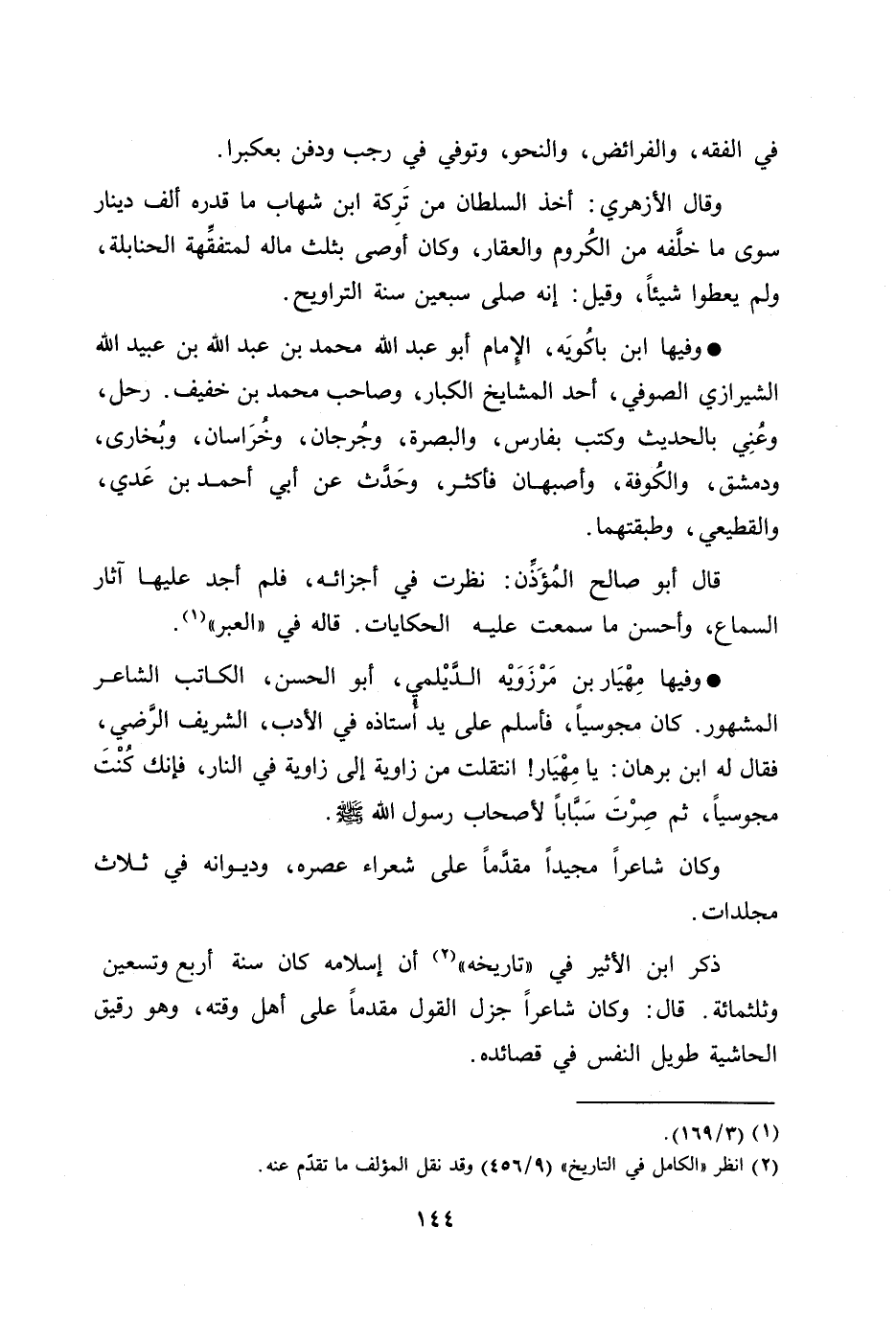 وفيها مهيار بن مرزويه الدّيلمي، أبو الحسن، الكاتب الشاعر المشهور. كان مجوسيا، فأسلم على يد أستاذه في الأدب، الشريف الرّضي، فقال له ابن برهان: يا مهيار! انتقلت من زاوية إلى زاوية في النار، فإنك كنت مجوسيا، ثم صرت سبّابا لأصحاب رسول الله صلّى الله عليه وسلّم.