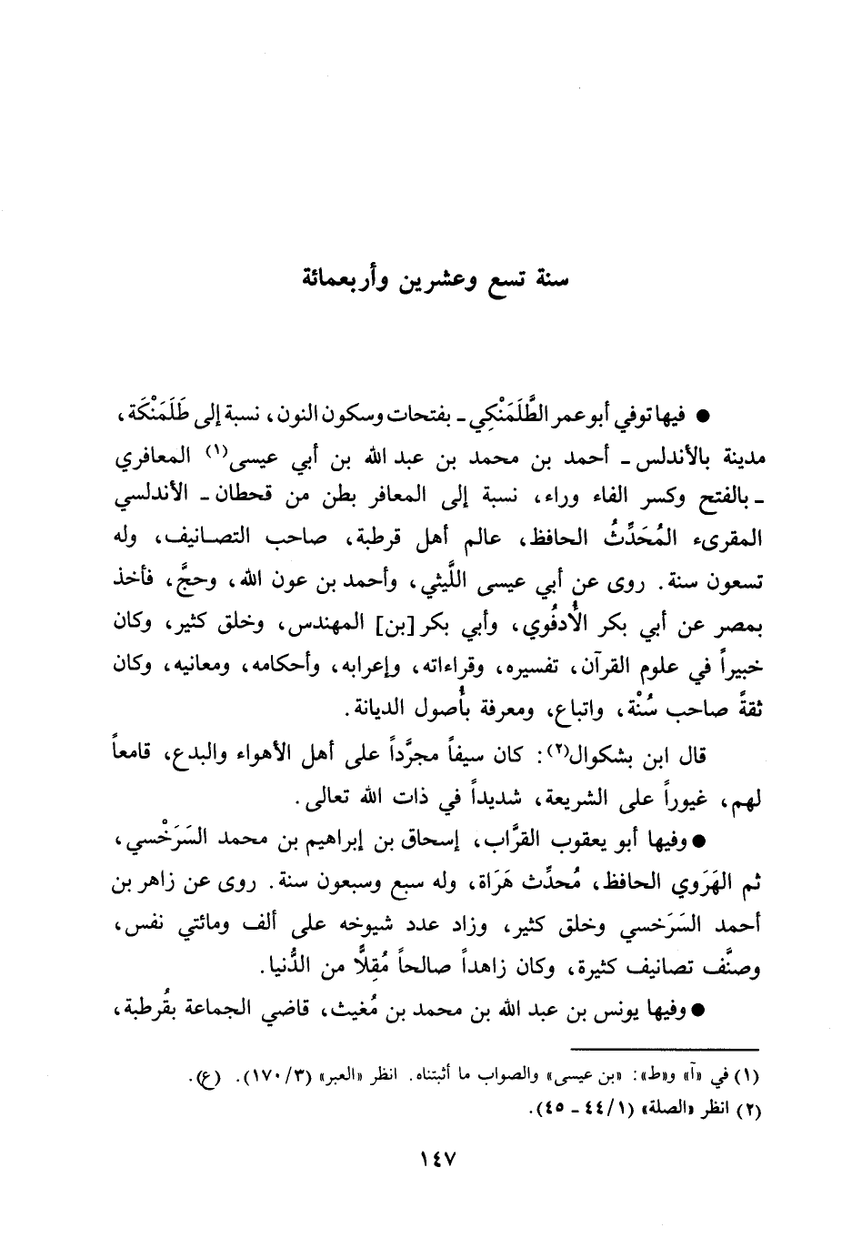 فيها توفي أبو عمر الطّلمنكي- بفتحات وسكون النون، نسبة إلى طلمنكة، مدينة بالأندلس- أحمد بن محمد بن عبد الله بن أبي عيسى [1] المعافري- بالفتح وكسر الفاء وراء، نسبة إلى المعافر بطن من قحطان- الأندلسي المقرئ المحدّث الحافظ، عالم أهل قرطبة، صاحب التصانيف، وله تسعون سنة. روى عن أبي عيسى اللّيثي، وأحمد بن عون الله، وحجّ، فأخذ بمصر عن أبي بكر الأدفوي، وأبي بكر [بن] المهندس، وخلق كثير، وكان خبيرا في علوم القرآن، تفسيره، وقراءاته، وإعرابه، وأحكامه، ومعانيه، وكان ثقة صاحب سنة، واتباع، ومعرفة بأصول الديانة.