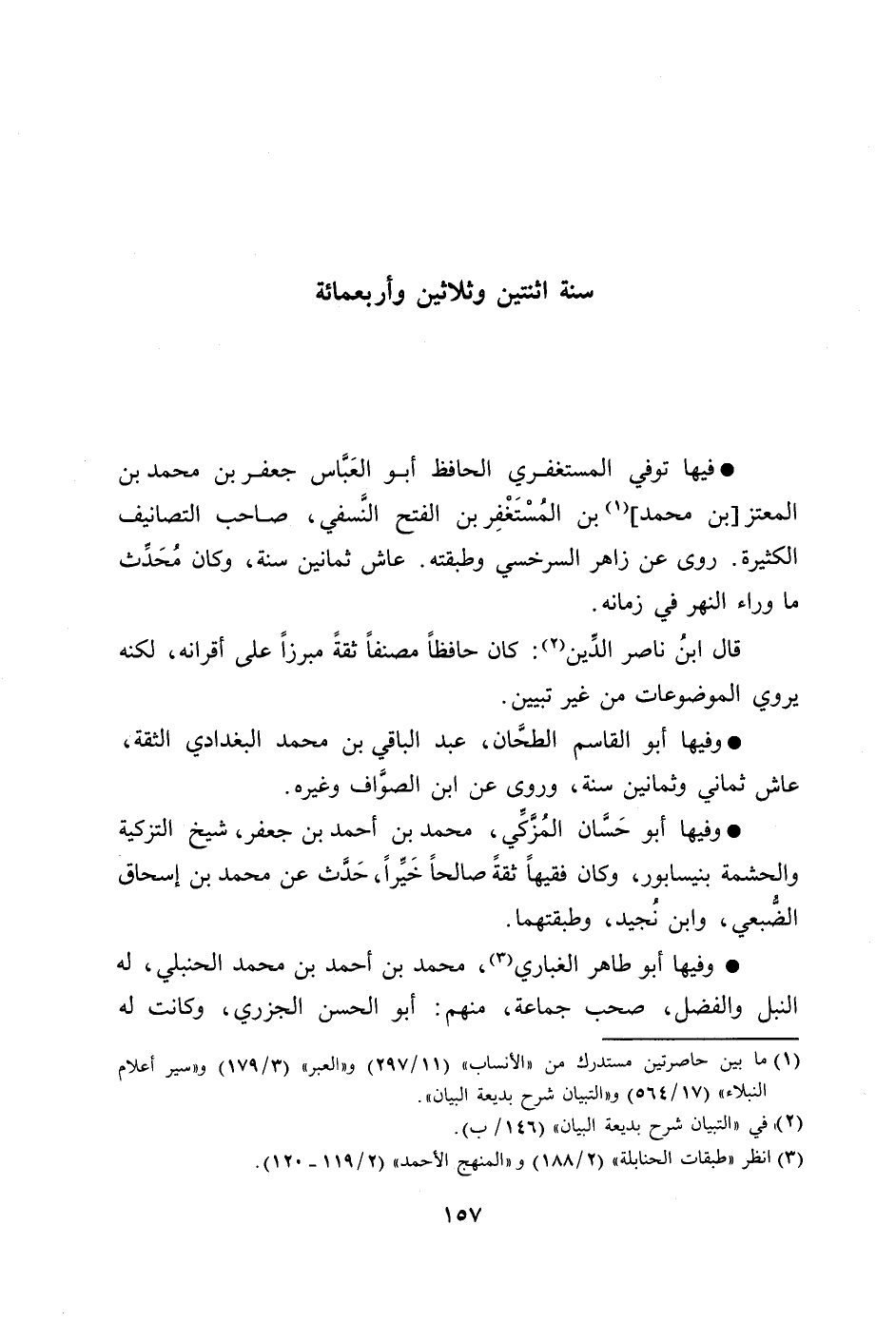 فيها توفي المستغفري الحافظ أبو العبّاس جعفر بن محمد بن المعتز [بن محمد] [1] بن المستغفر بن الفتح النّسفي، صاحب التصانيف الكثيرة. روى عن زاهر السرخسي وطبقته. عاش ثمانين سنة، وكان محدّث ما وراء النهر في زمانه.