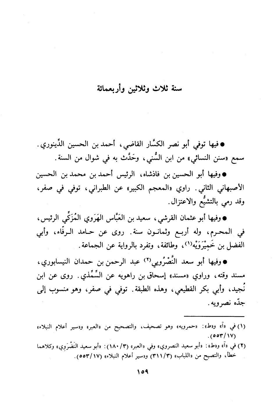 وفيها أبو سعيد النّصرويي [2] عبد الرحمن بن حمدان النيسابوري، مسند وقته، وراوي «مسند» إسحاق بن راهويه عن السّمّذي. روى عن ابن نجيد، وأبي بكر القطيعي، وهذه الطبقة. توفي في صفر، وهو منسوب إلى جدّه نصرويه.