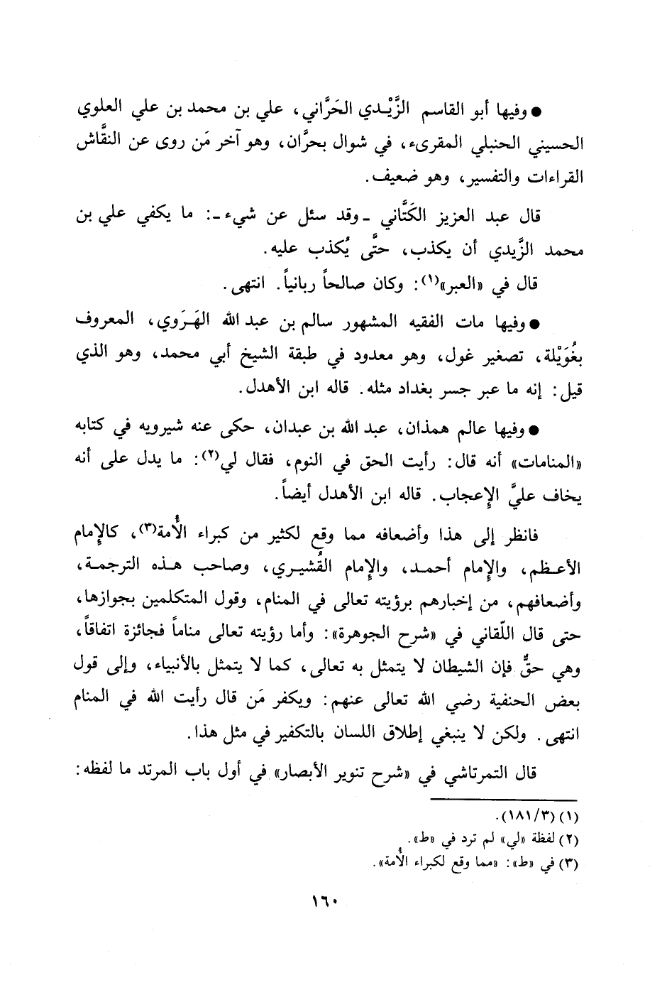 فانظر إلى هذا وأضعافه مما وقع لكثير من كبراء الأمة [3] ، كالإمام الأعظم، والإمام أحمد، والإمام القشيري، وصاحب هذه الترجمة، وأضعافهم، من إخبارهم برؤيته تعالى في المنام، وقول المتكلمين بجوازها، حتى قال اللّقاني في «شرح الجوهرة» : وأما رؤيته تعالى مناما فجائزة اتفاقا، وهي حقّ فإن الشيطان لا يتمثل به تعالى، كما لا يتمثل بالأنبياء، وإلى قول بعض الحنفية رضي الله تعالى عنهم: ويكفر من قال رأيت الله في المنام انتهى. ولكن لا ينبغي إطلاق اللسان بالتكفير في مثل هذا.
