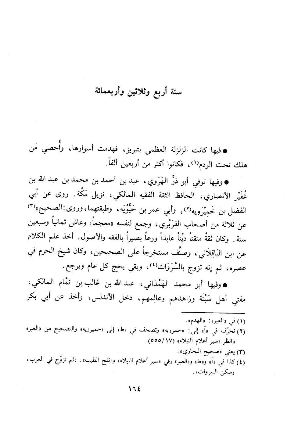 وفيها توفي أبو ذرّ الهروي، عبد بن أحمد بن محمد بن عبد الله بن غفير الأنصاري، الحافظ الثقة الفقيه المالكي، نزيل مكّة. روى عن أبي الفضل بن خميرويه [2] ، وأبي عمر بن حيّويه، وطبقتهما، وروى «الصحيح» [3] عن ثلاثة من أصحاب الفربري، وجمع لنفسه «معجما» وعاش ثمانيا وسبعين سنة. وكان ثقة متقنا ديّنا عابدا ورعا بصيرا بالفقه والأصول. أخذ علم الكلام عن ابن الباقلاني، وصنّف مستخرجا على الصحيحين، وكان شيخ الحرم في عصره، ثم إنه تزوج بالسّروات [4] ، وبقي يحج كل عام ويرجع.