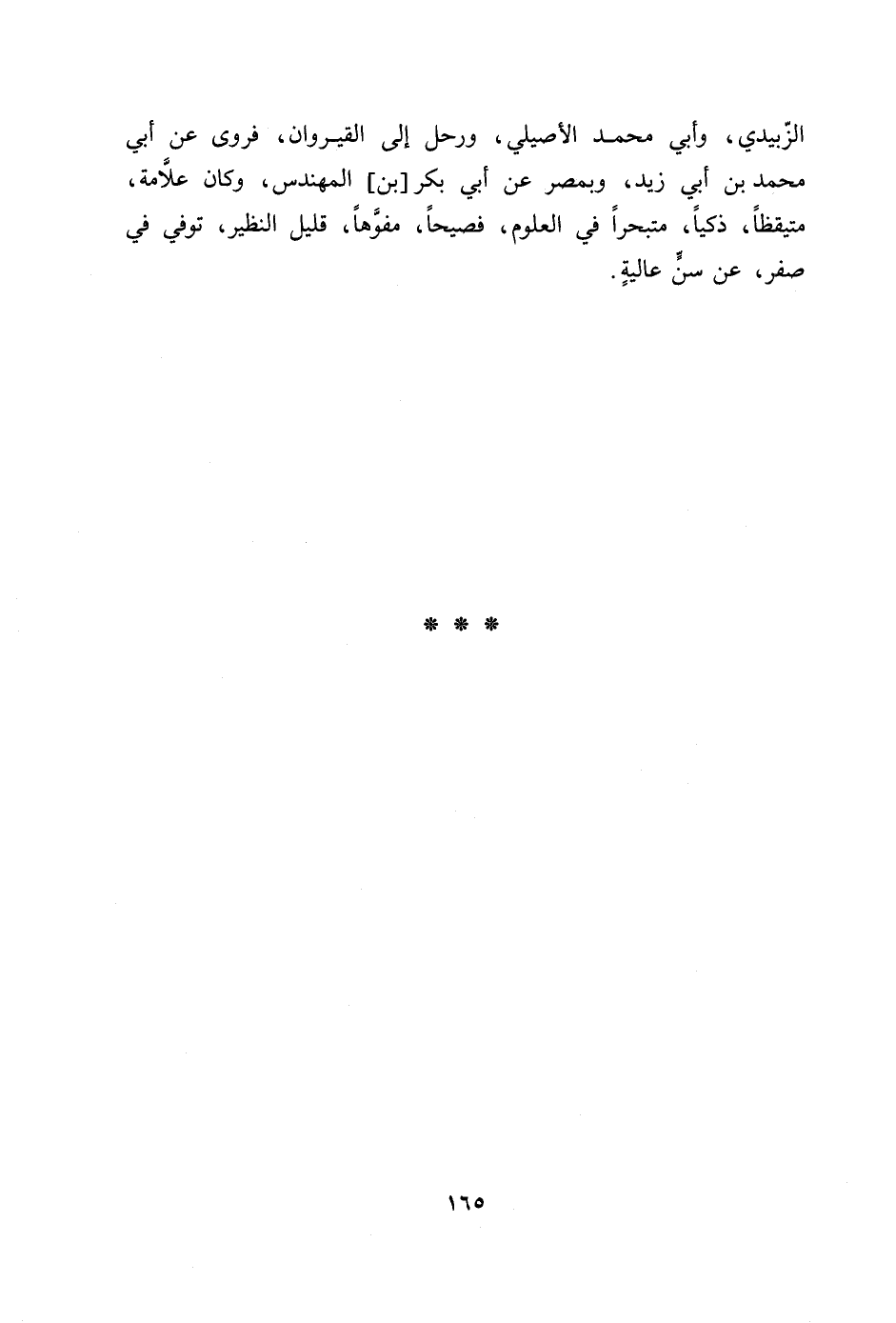 الزّبيدي، وأبي محمد الأصيلي، ورحل إلى القيروان، فروى عن أبي محمد بن أبي زيد، وبمصر عن أبي بكر [بن] المهندس، وكان علّامة، متيقظا، ذكيا، متبحرا في العلوم، فصيحا، مفوّها، قليل النظير، توفي في صفر، عن سنّ عالية.
