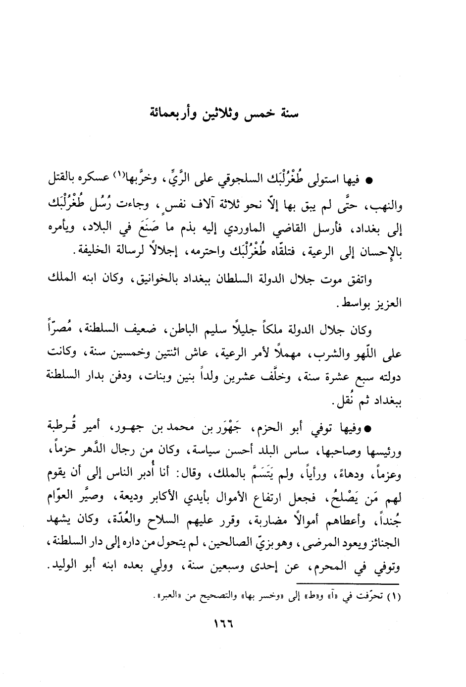 فيها استولى طغرلبك السلجوقي على الرّيّ، وخرّبها [1] عسكره بالقتل والنهب، حتّى لم يبق بها إلّا نحو ثلاثة آلاف نفس، وجاءت رسل طغرلبك إلى بغداد، فأرسل القاضي الماوردي إليه بذم ما صنع في البلاد، ويأمره بالإحسان إلى الرعية، فتلقّاه طغرلبك واحترمه، إجلالا لرسالة الخليفة.