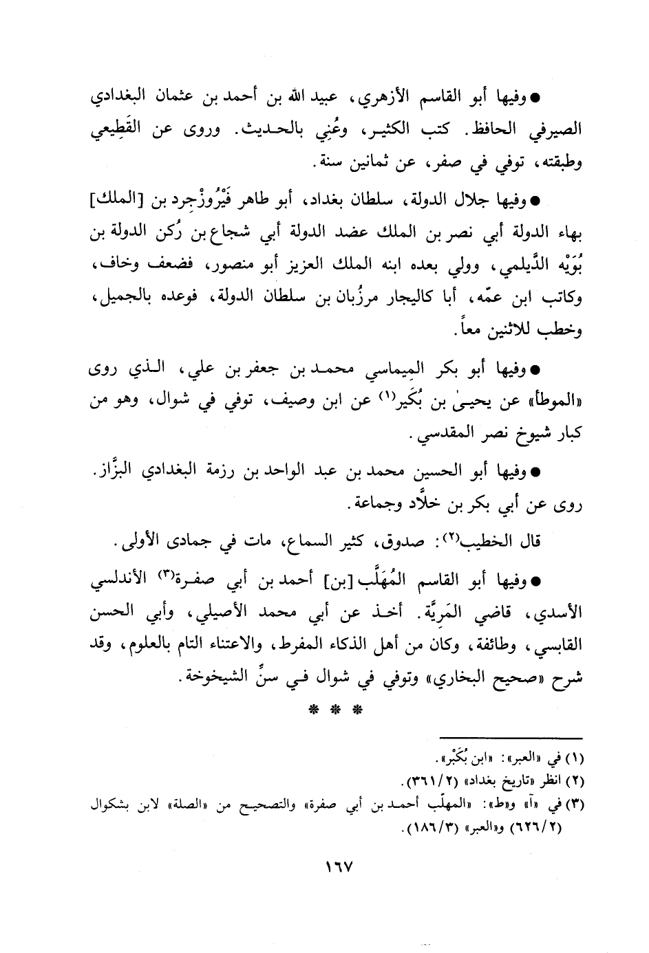وفيها أبو القاسم الأزهري، عبيد الله بن أحمد بن عثمان البغدادي الصيرفي الحافظ. كتب الكثير، وعني بالحديث. وروى عن القطيعي وطبقته، توفي في صفر، عن ثمانين سنة.