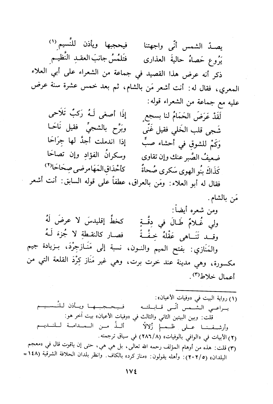 قلت: وبين البيتين الثاني والثالث في «وفيات الأعيان» بيت آخر هو،